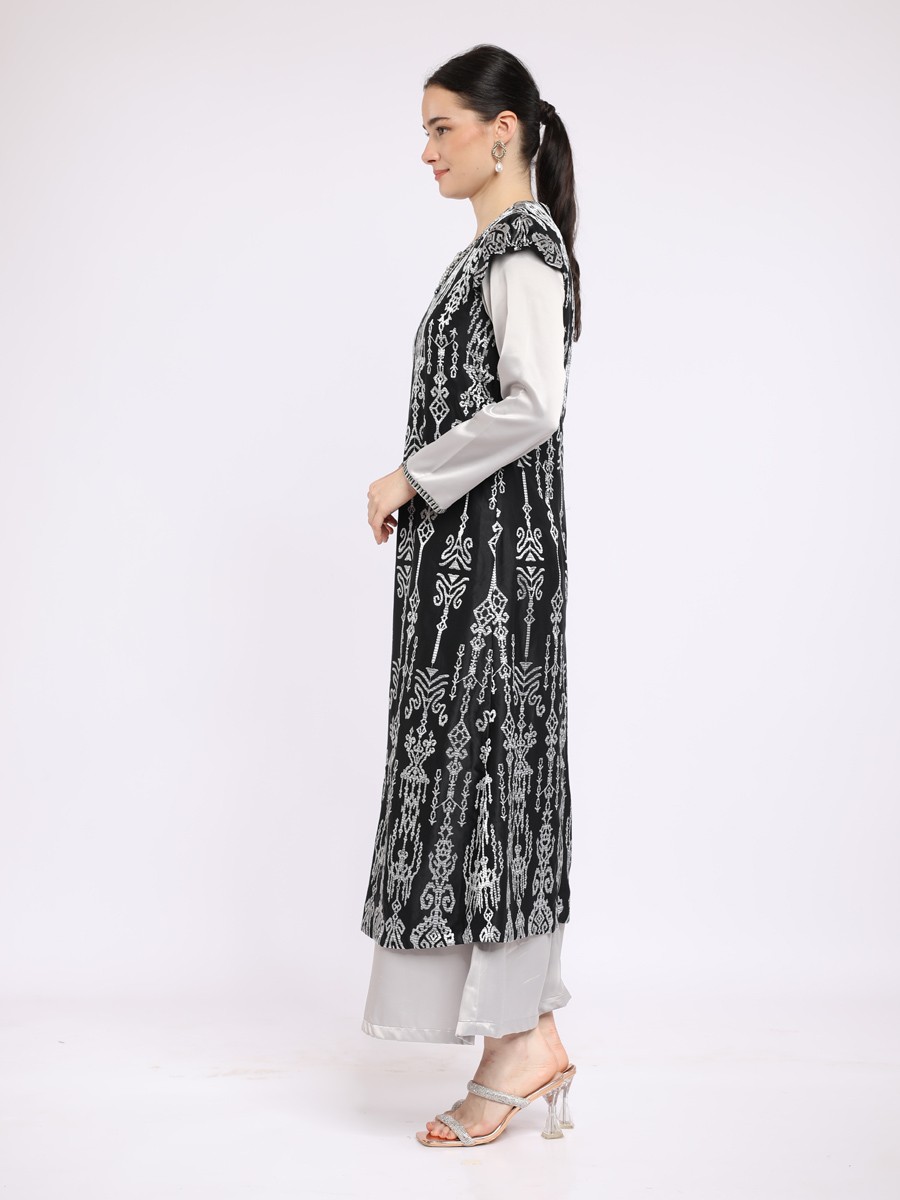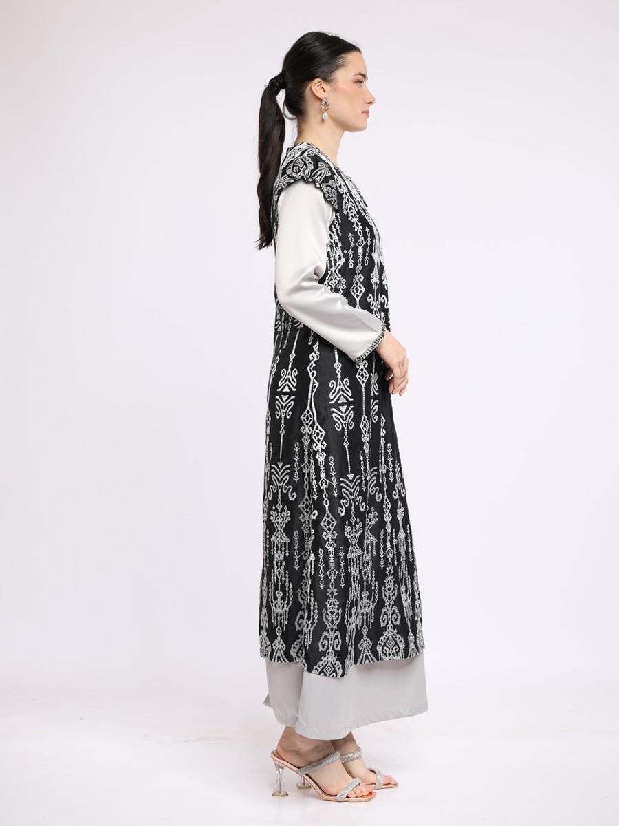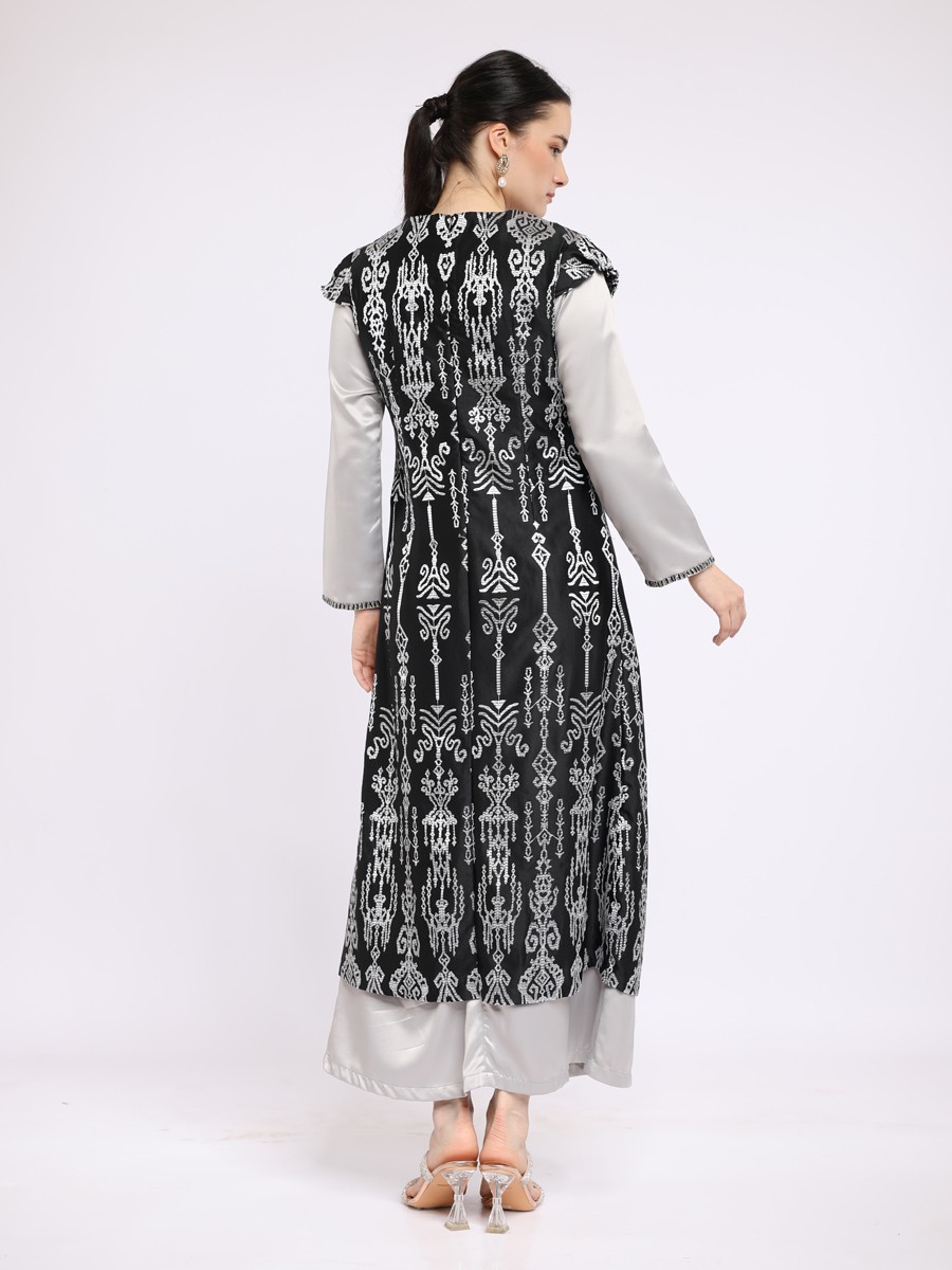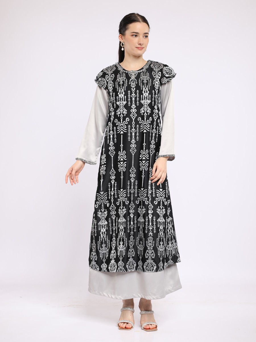 A black and grey maxi dress with a statement of elegance and drama.Designed with tribal embroidery patterns,this dress brings a bold yet graceful silhouette that commands attention.Its delicate beaded neckline adds a touch of luxury and sparkle,creating an eye-catching focal point.