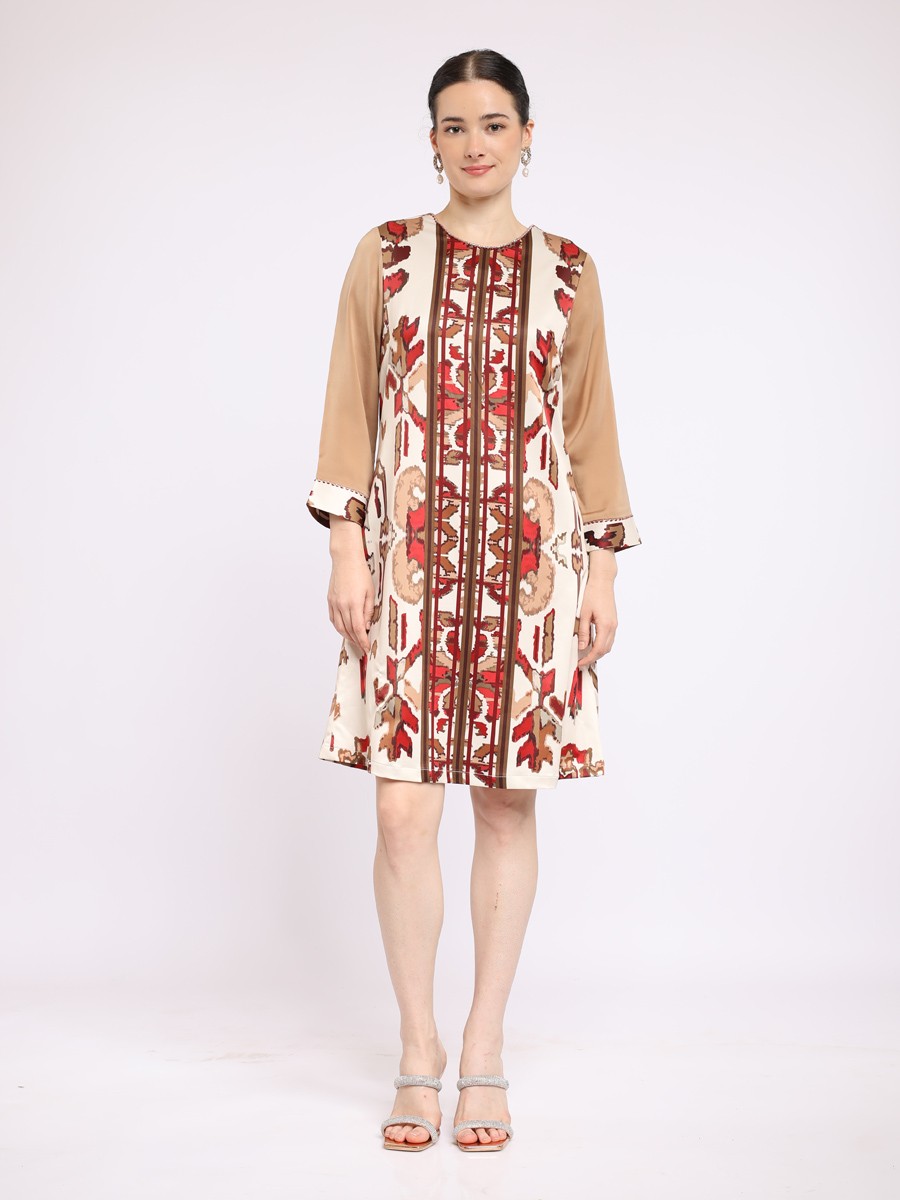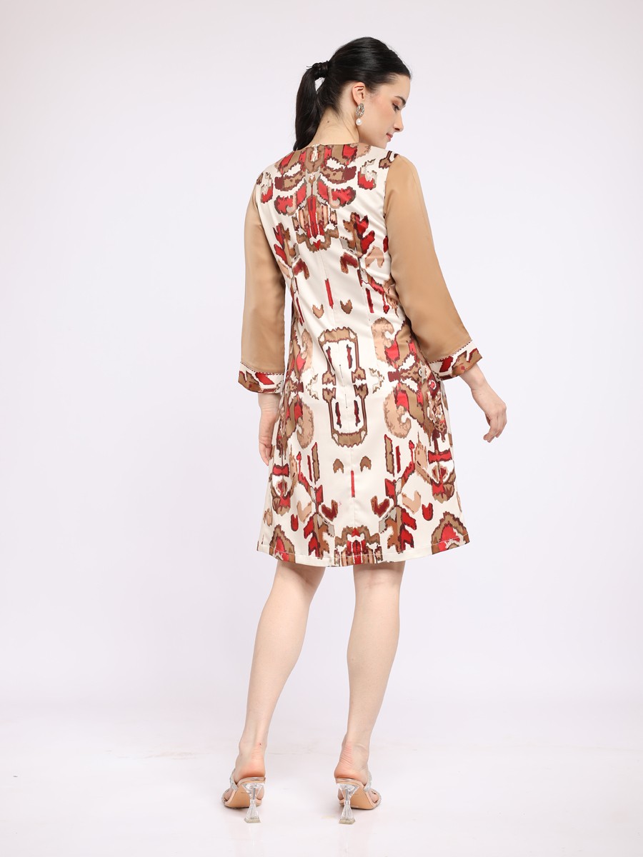 A simple elegance medium length dress.Designed with influence of traditional Indian Ikat pattern,this RUBBY IKAT PATTERN dress brings a bold yet simple silhouette.Its beaded neckline adds a touch of luxury and sparkle.