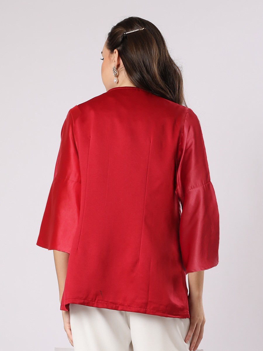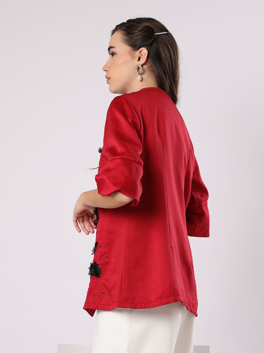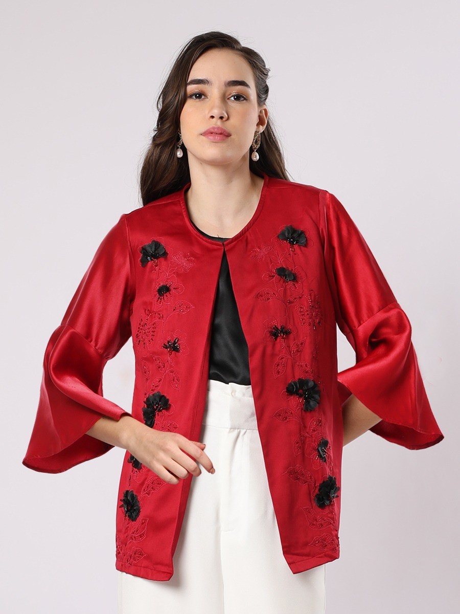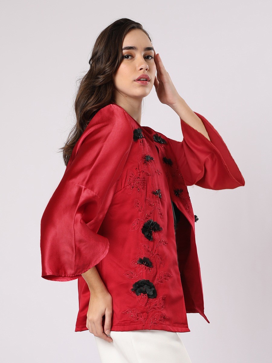 A bold red short jacket,lightweight with a uniquely sleeve.Designed with tonal floral embroidery patterns and rich detail on black flower petals applications.Sleeveless satin inner tops included.