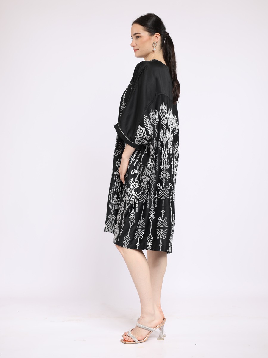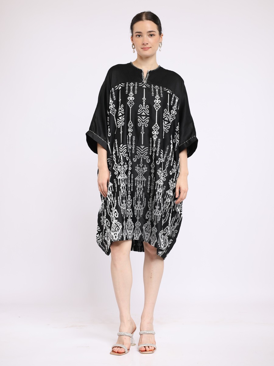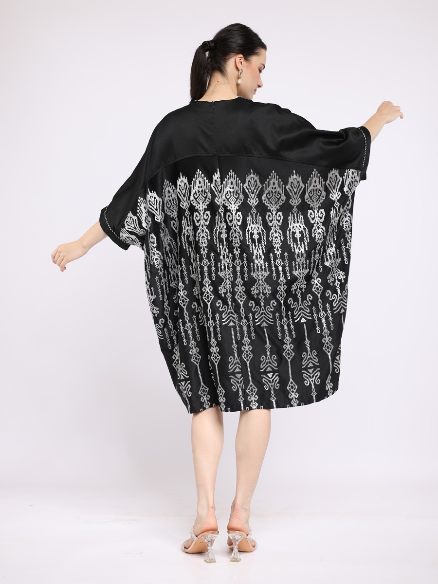 A Show-stopping statement of elegance and drama.Designed with tribal embroidery patterns,this dress brings a bold yet graceful silhouette that commands attention.Its beaded neckline adds a touch of luxury and sparkle,creating an eye-catching focal point.