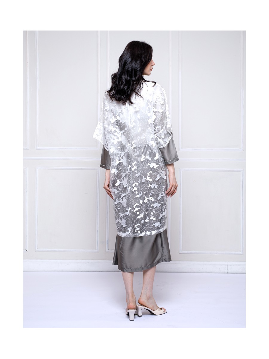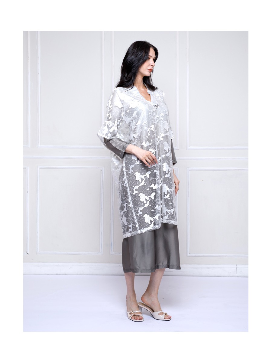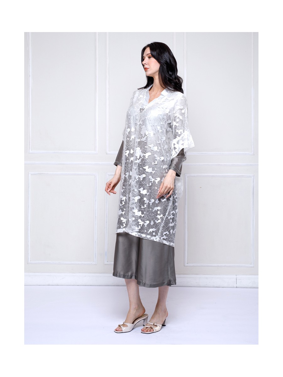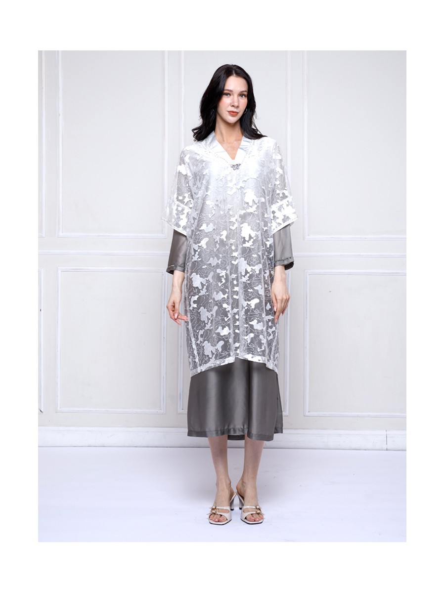 A white and grey-green maxi dress with a statement of soft elegance.Designed with a kaftan silhouette shape from embroidered tule fabrics,its delicate beaded neckline adds a touch of luxury and sparkle,creating an eye-catching focal point.