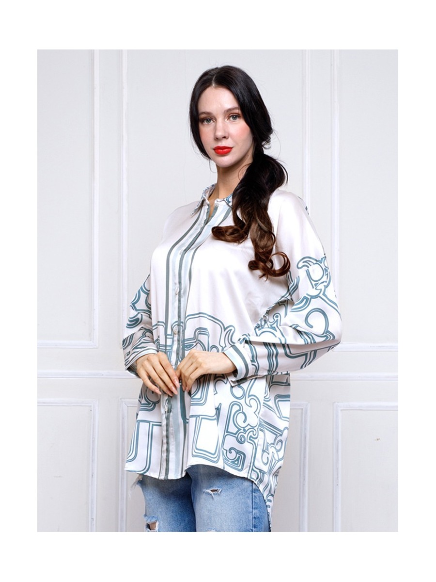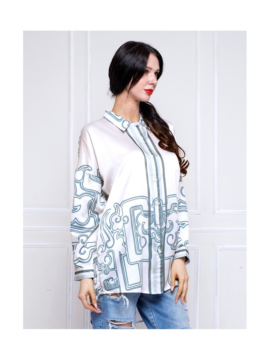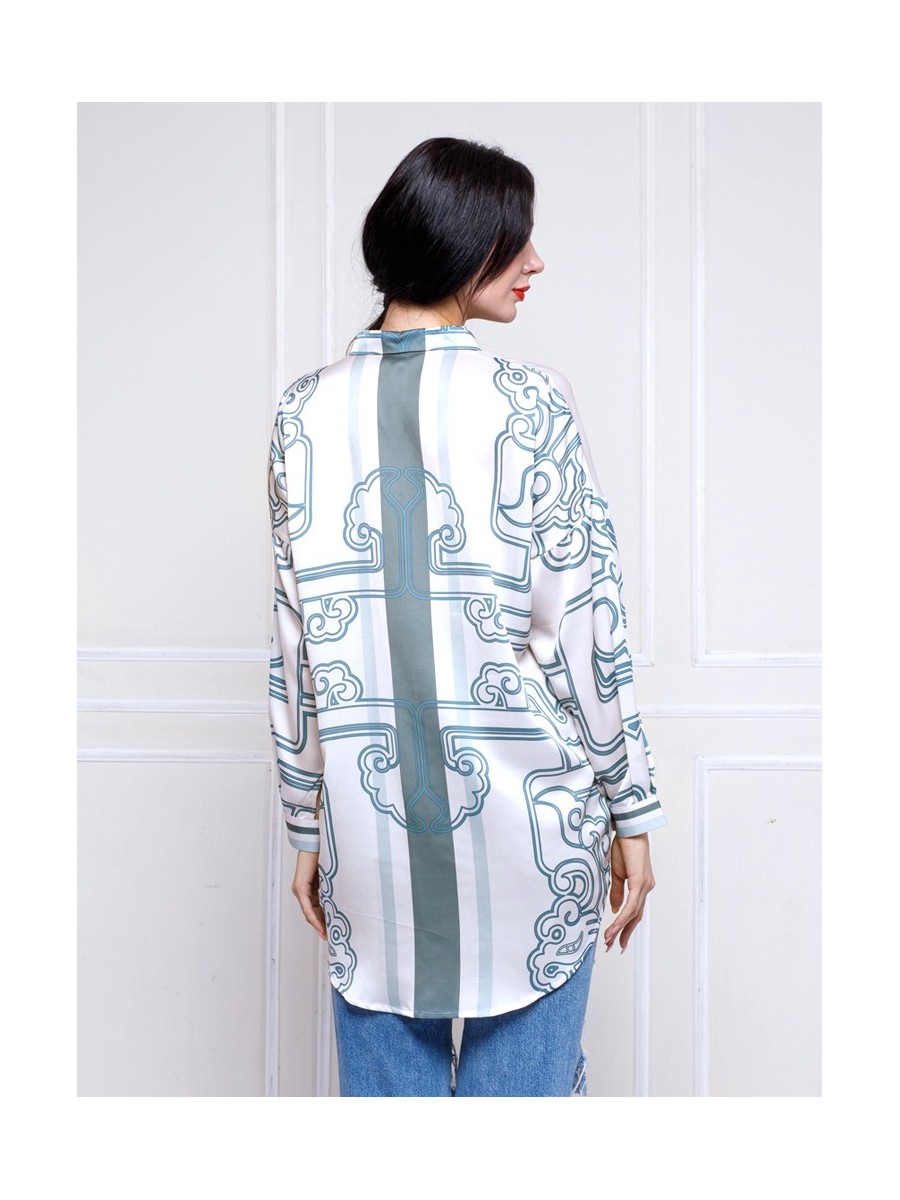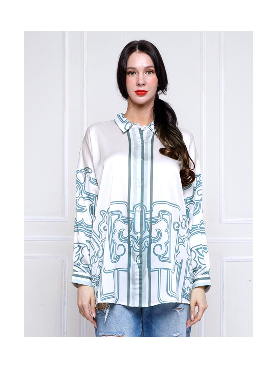 This shirt highlights the comfort fits and the JADE ORNAMENTS print patterns.Designed with a drop shoulder and oversized relaxed silhouette,this shirt includes a front button opening,full sleeves with matching buttoned cuffs.The Green Chinese jade colour range and pattern enchances its modern appeal,making it a versatile piace.