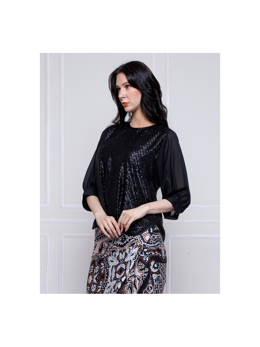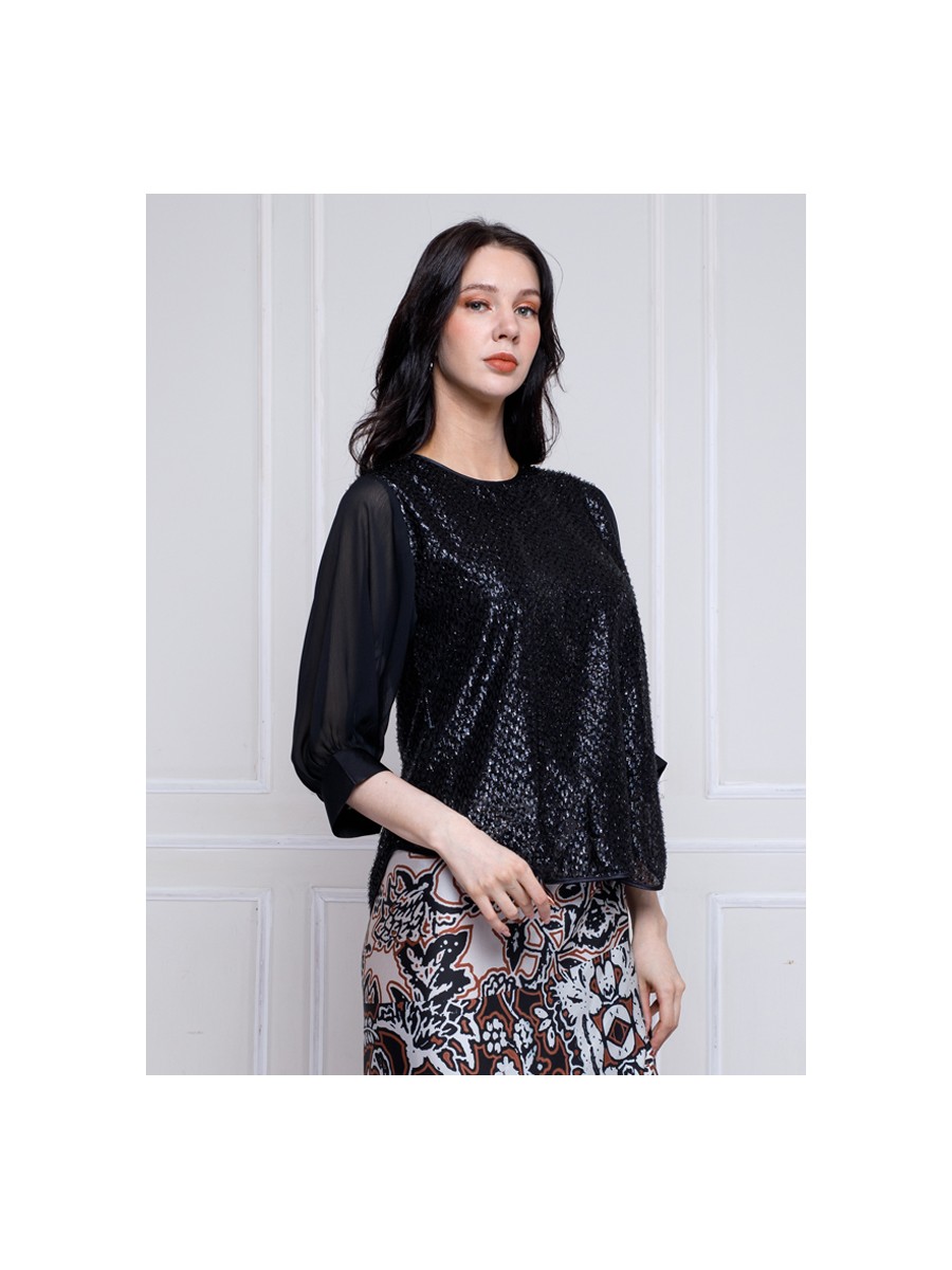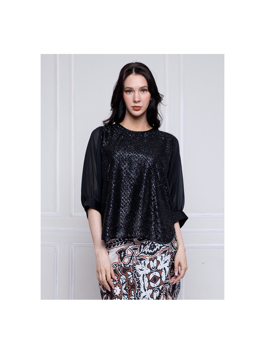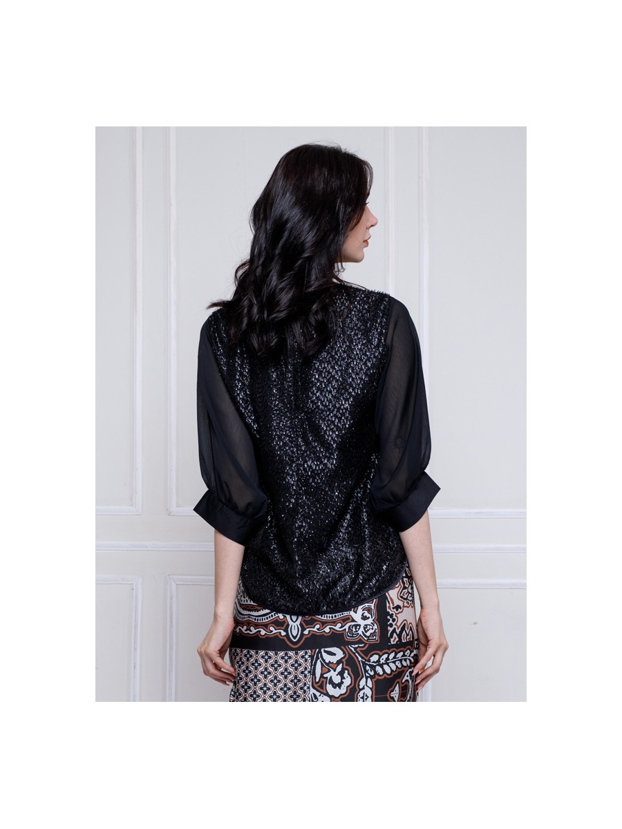 An Elegant Black Lurex Blouse with a semi balloon and raglan sleeve cuts.With statement effect from the shape and materials itself make your looks more elegant.The cut and shape make your movements more comfortable.