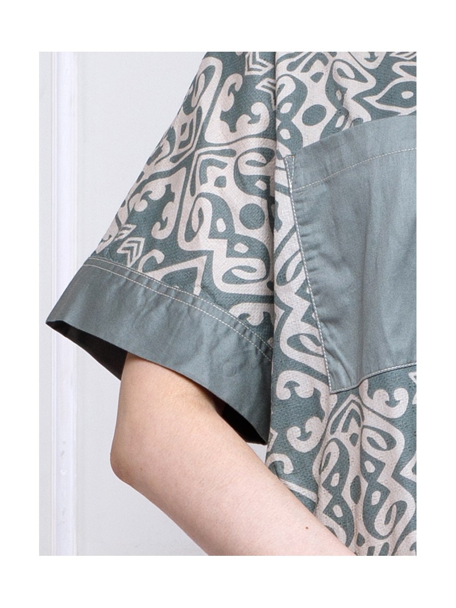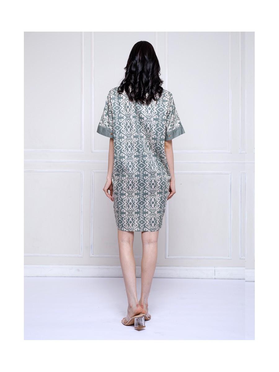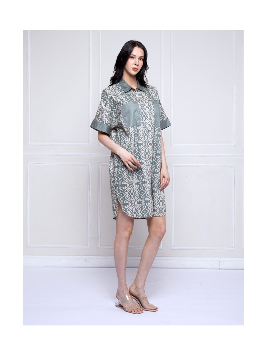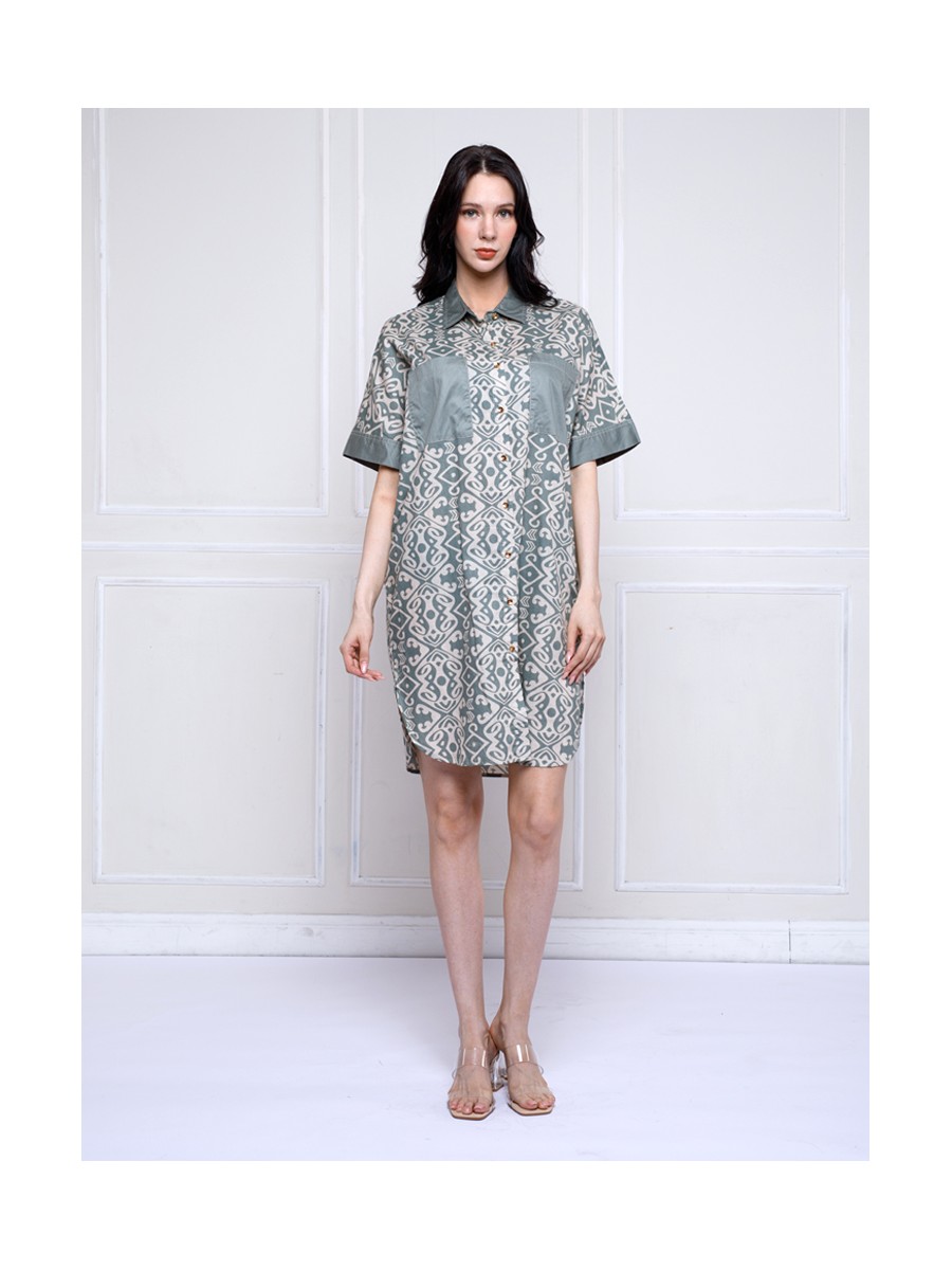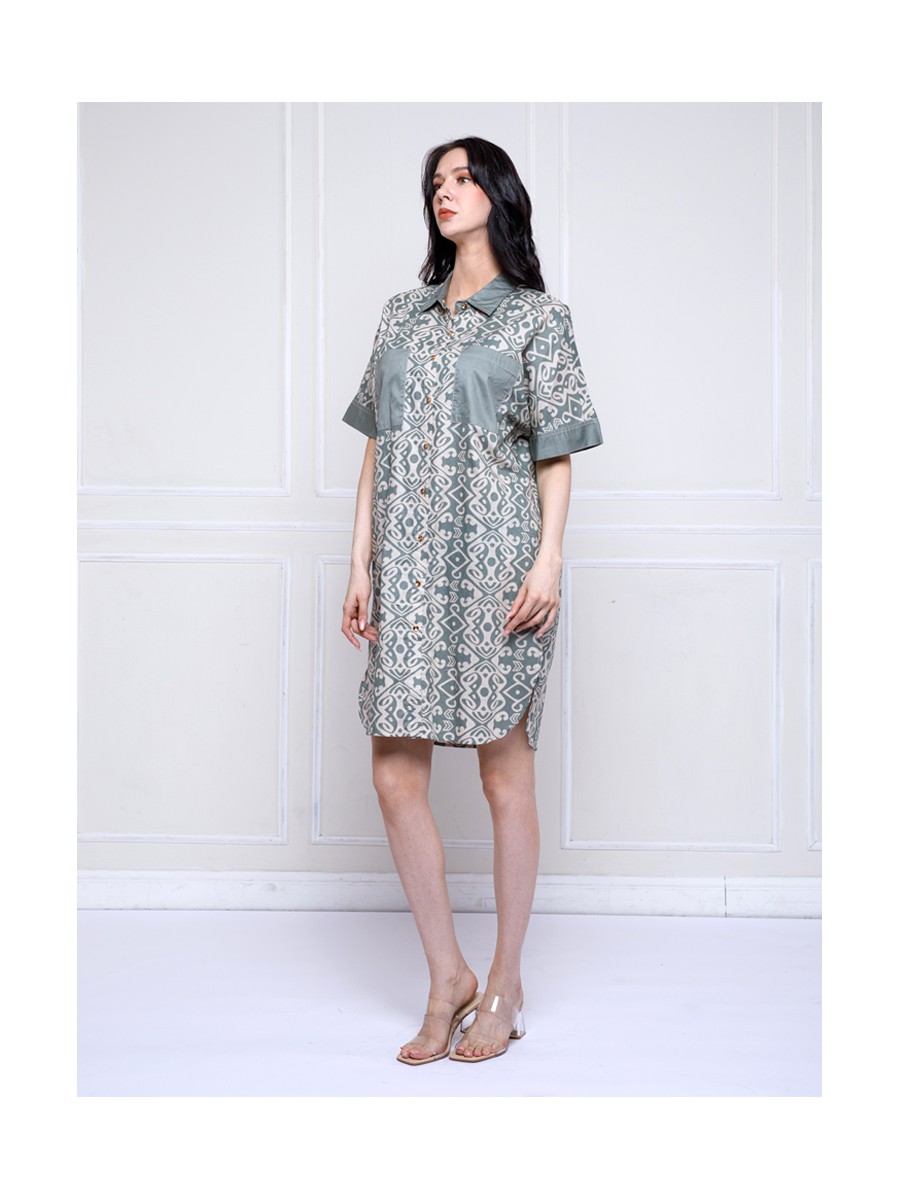 This versatile shirt dress combines a comfortable,relaxed silhouette with a jade and khakis ethnic pattern on cotton dobby.Key features include a drop shoulder design,1/2 sleeves,chest pockets and a stylish front with gold button opening.The high-quality cut-and-sew construction enchances its modern aesthetic,perfect for any occasion.