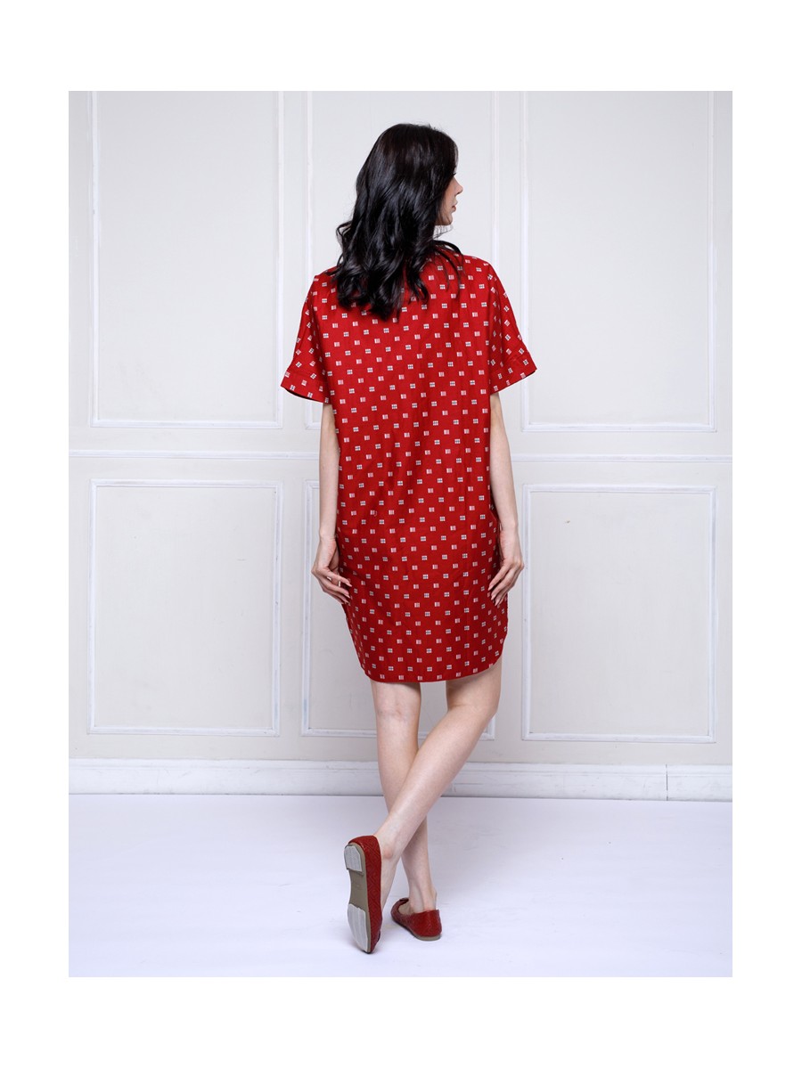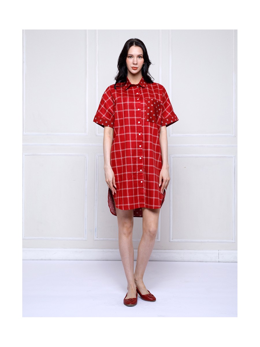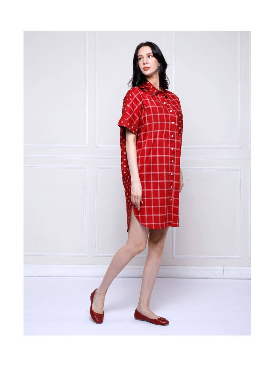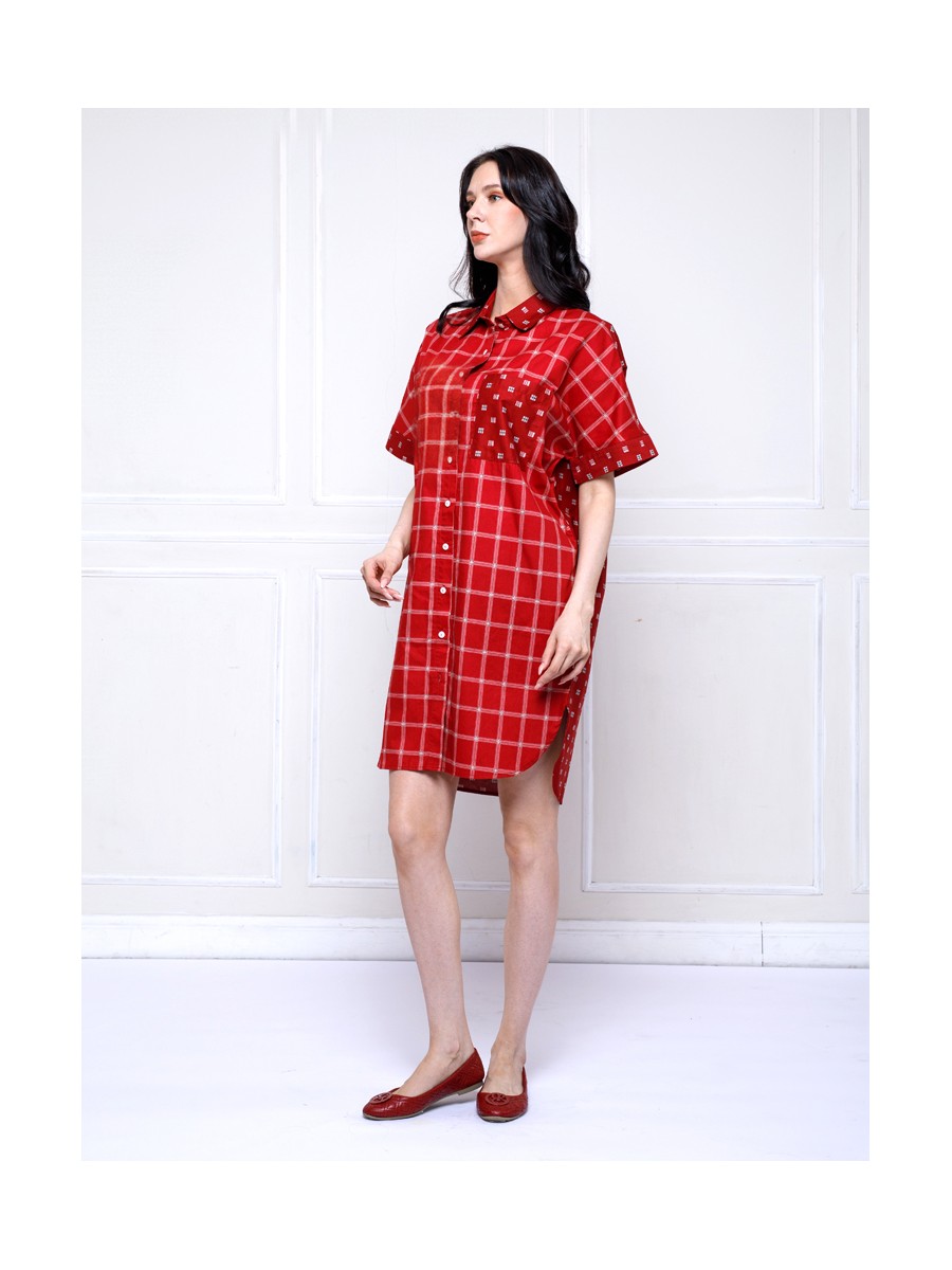 This versatile shirt dress combines a comfortable,relaxed silhouette with multy check patterns on cotton fabrics.Key features include a drop shoulder design,1/2 sleeves,chest pockets and a stylish front with gold button opening.The high-quality cut-and-sew construction enchancesits modern aesthetic,perfect for any occasion.