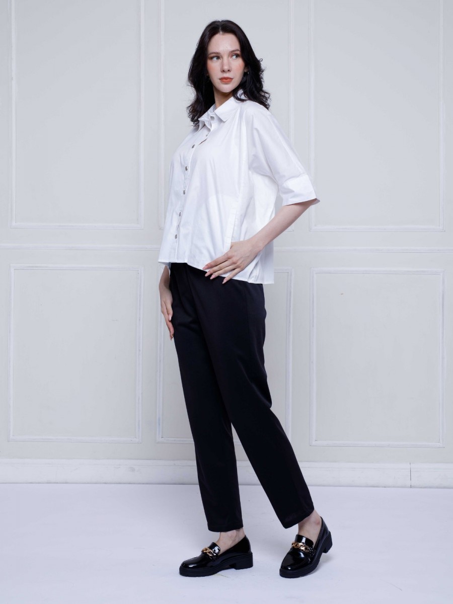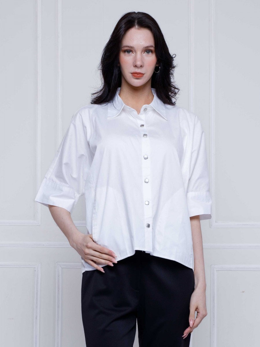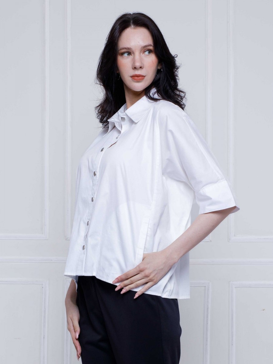 This versatile white shirt combines a comfortable and relaxed silhouette.Key features include a drop shoulder design,1/2 sleeves,a stylish front pocket and square silver button.The high-quality cut-and-sew construction enhances its modern aesthetic,perfect for any occasion.