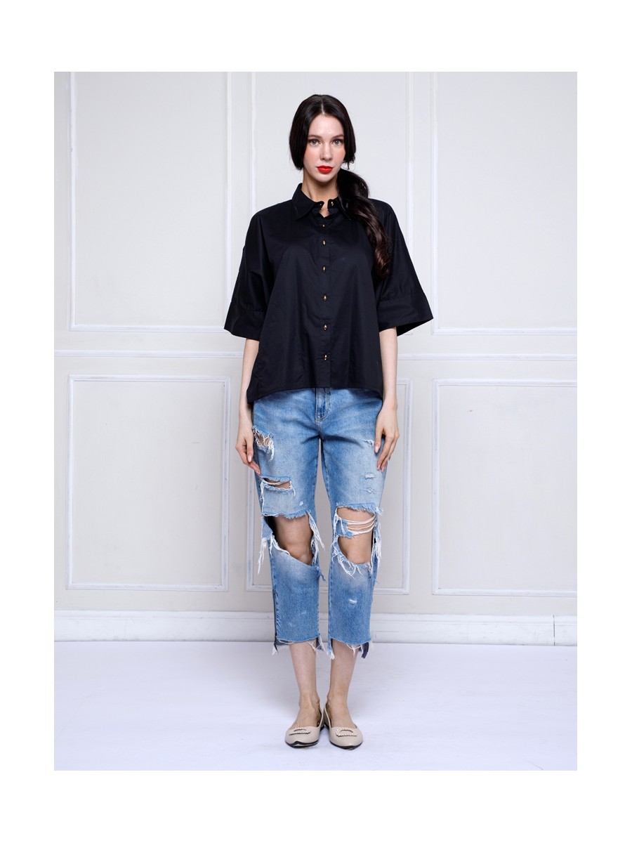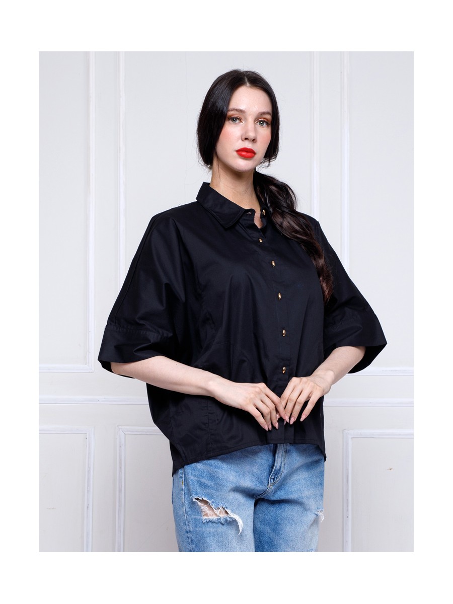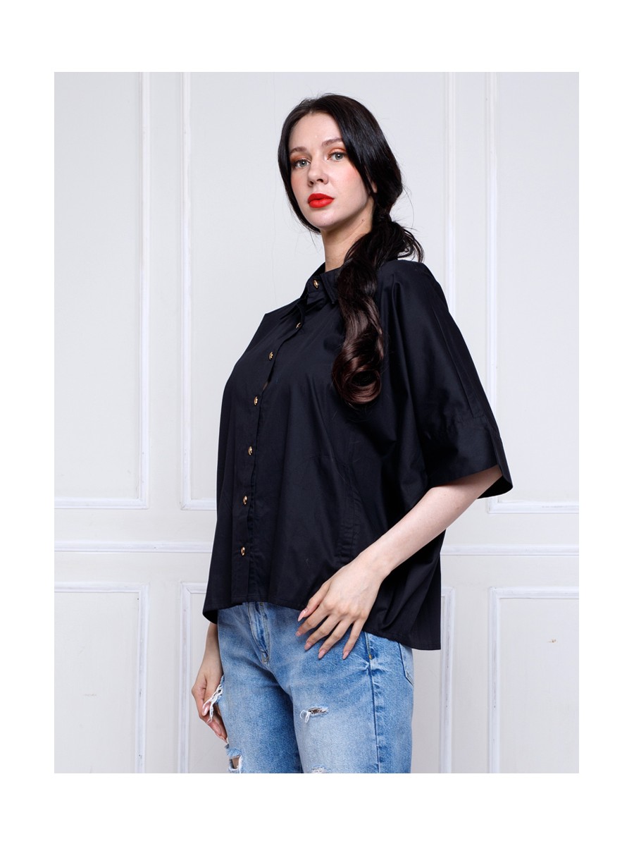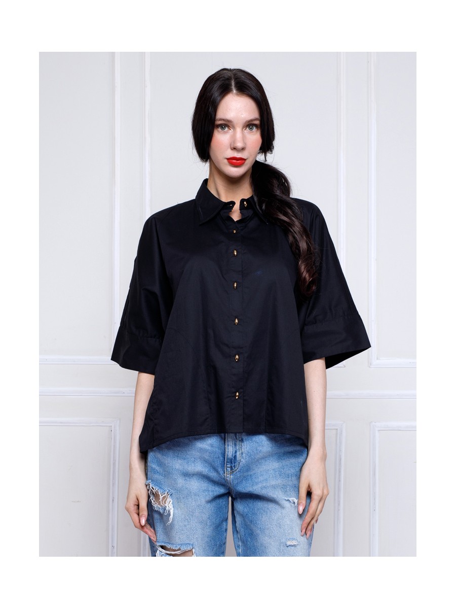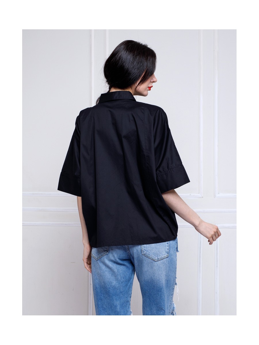 This versatile black shirt combines a comfortable and relaxed silhouette.Key features include a drop shoulder design,1/2 sleeves,a stylish front pocket and square silver button.The high-quality cut-and-sew construction enhances its modern aesthetic,perfect for any occasion.