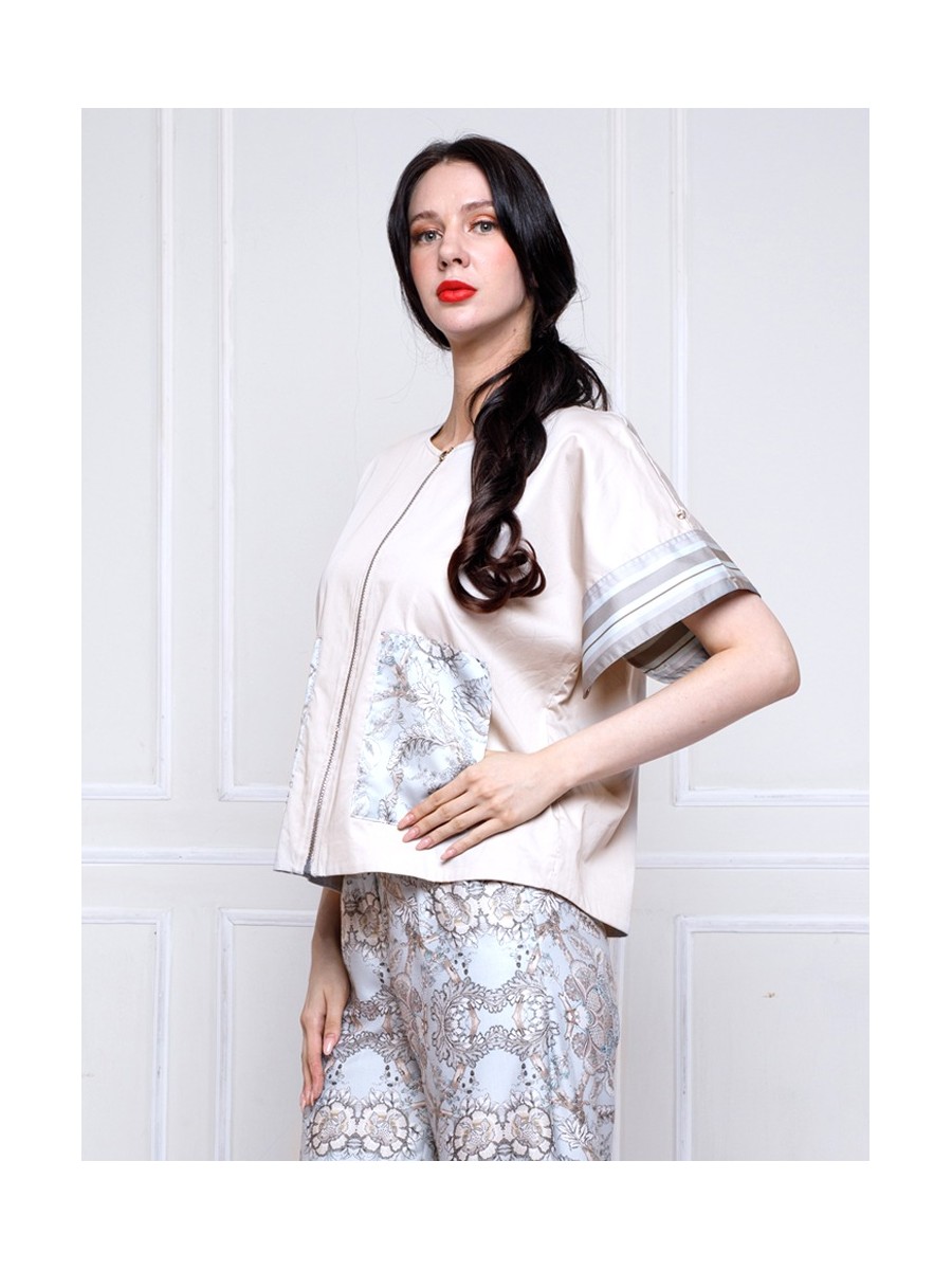 Crafted from luxurious Cotton Satin,this Zip Blouse is elegantly designed.It features a delicate 'Winter Flower' pattern beautifully combined with subtle stripes on the cuffs.The front is accented with a sleek silvery metal zipper and unique patch pockets.Pair it perfectly with the matching patterned palazzo pants for complete,sophisticated look.