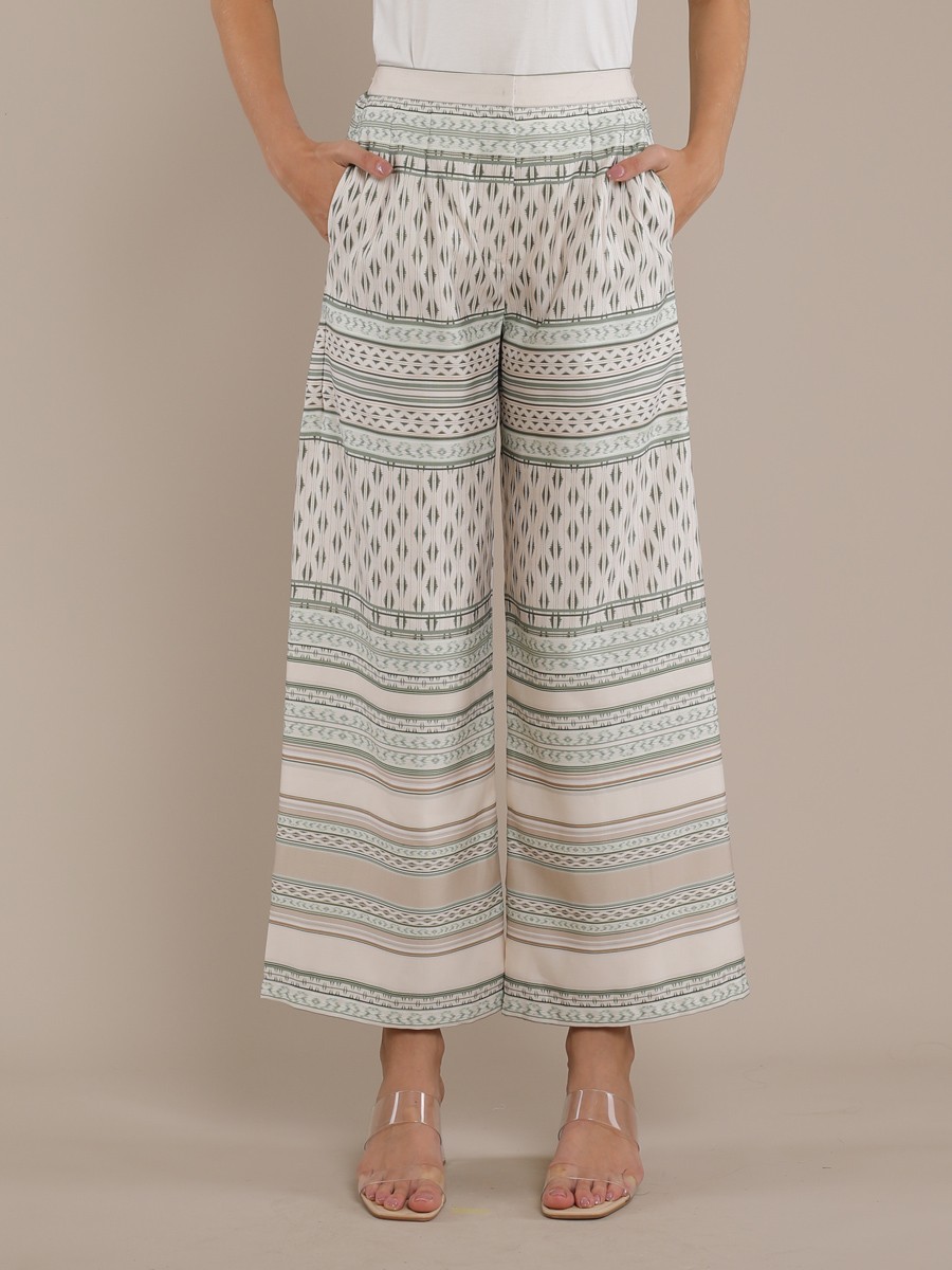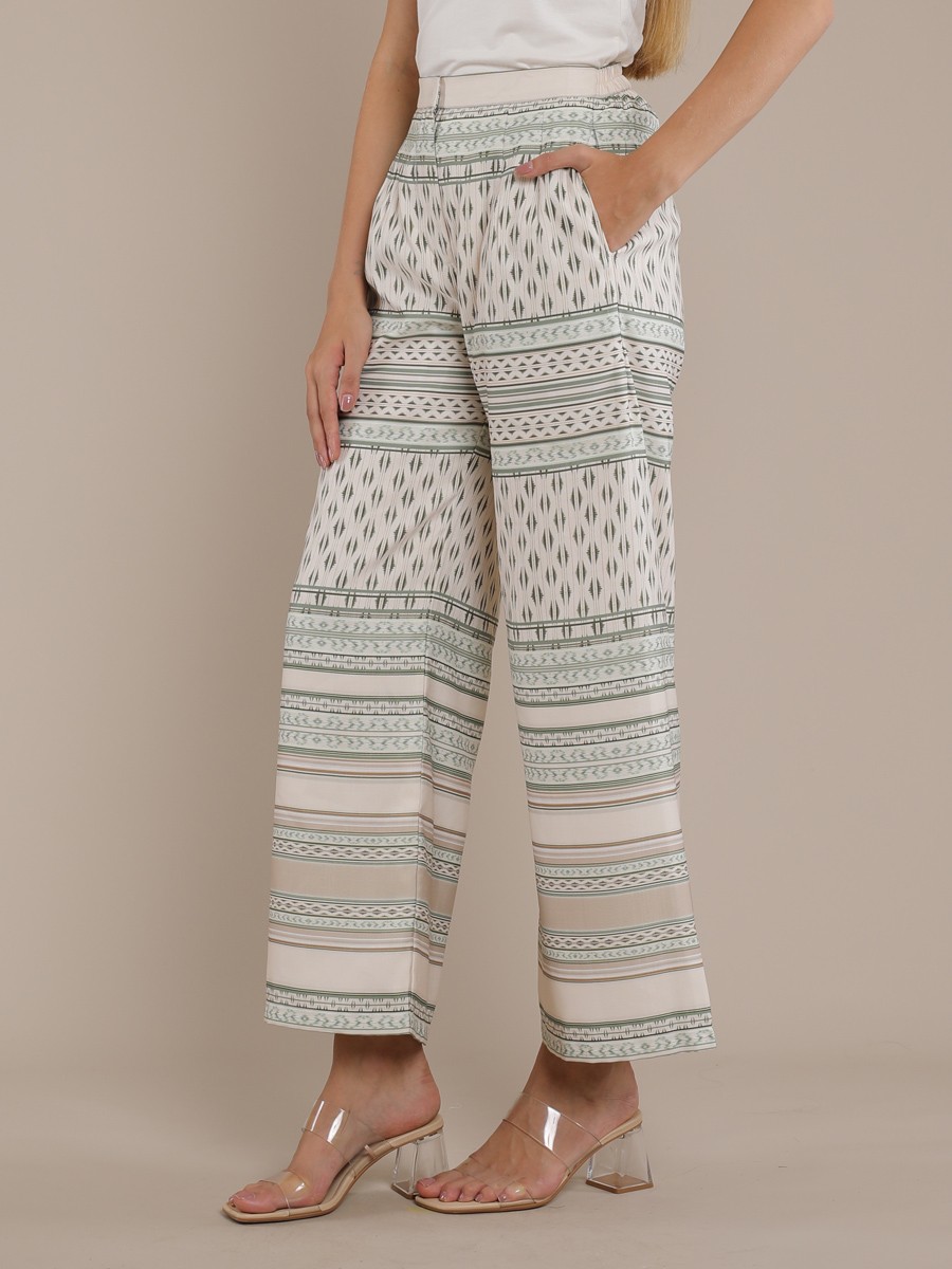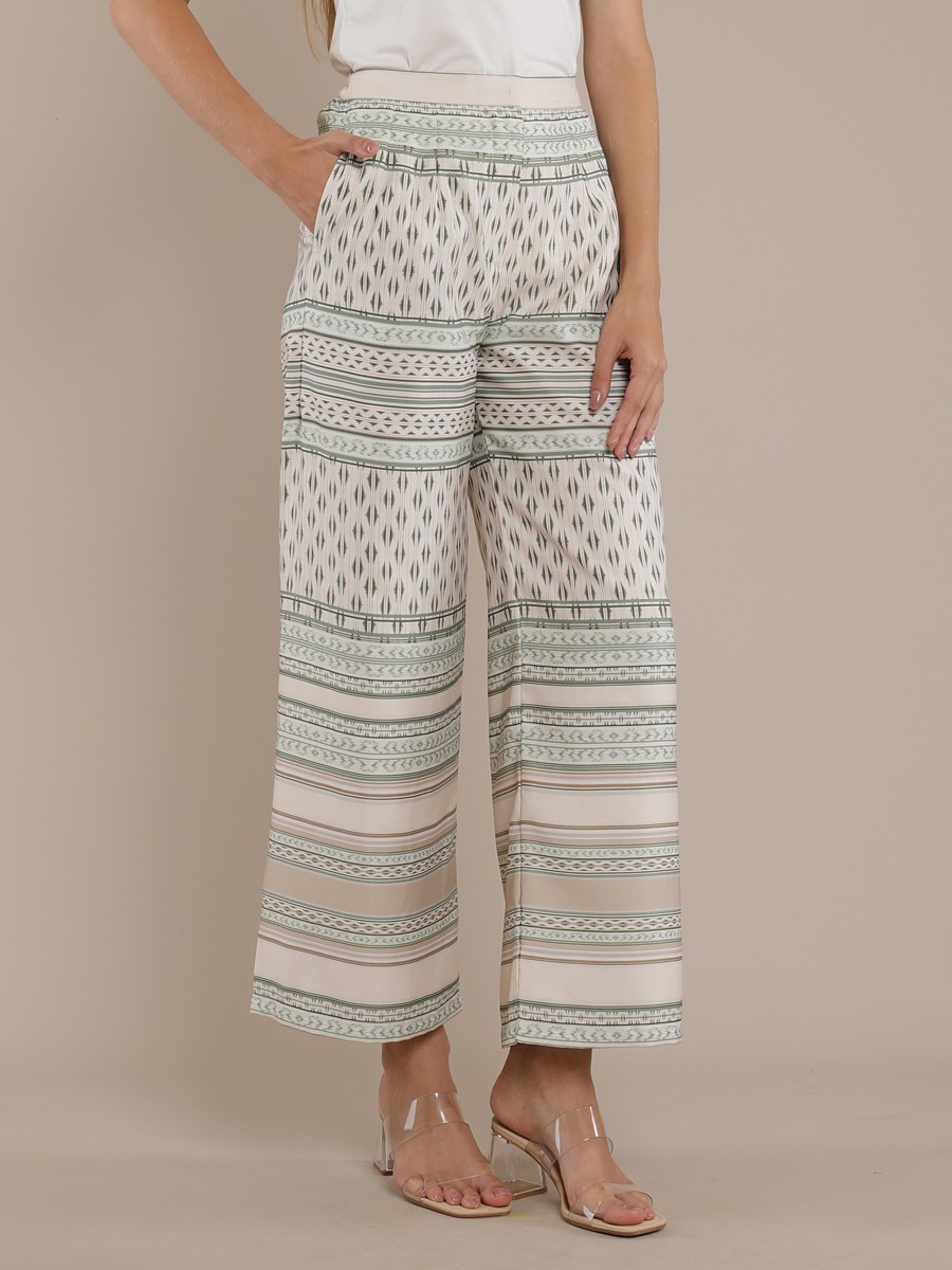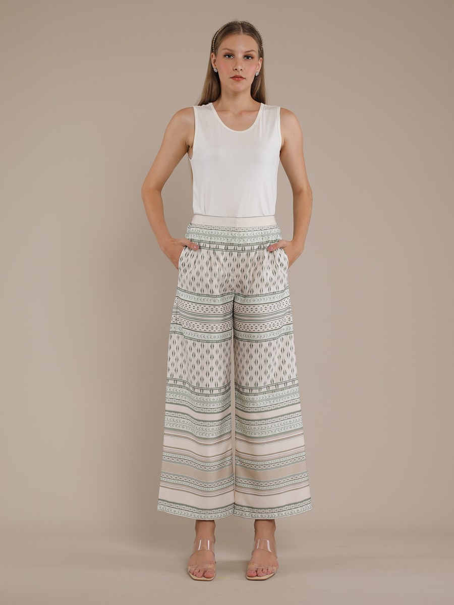 Designed with a delicate 'GREEN SUJI' pattern,these palazzo pants are crafted from a semi lustrous fabric that drapes beautifully,these pants feature a loose fitted silhouette with a high waisted cut with elastic waistband.
