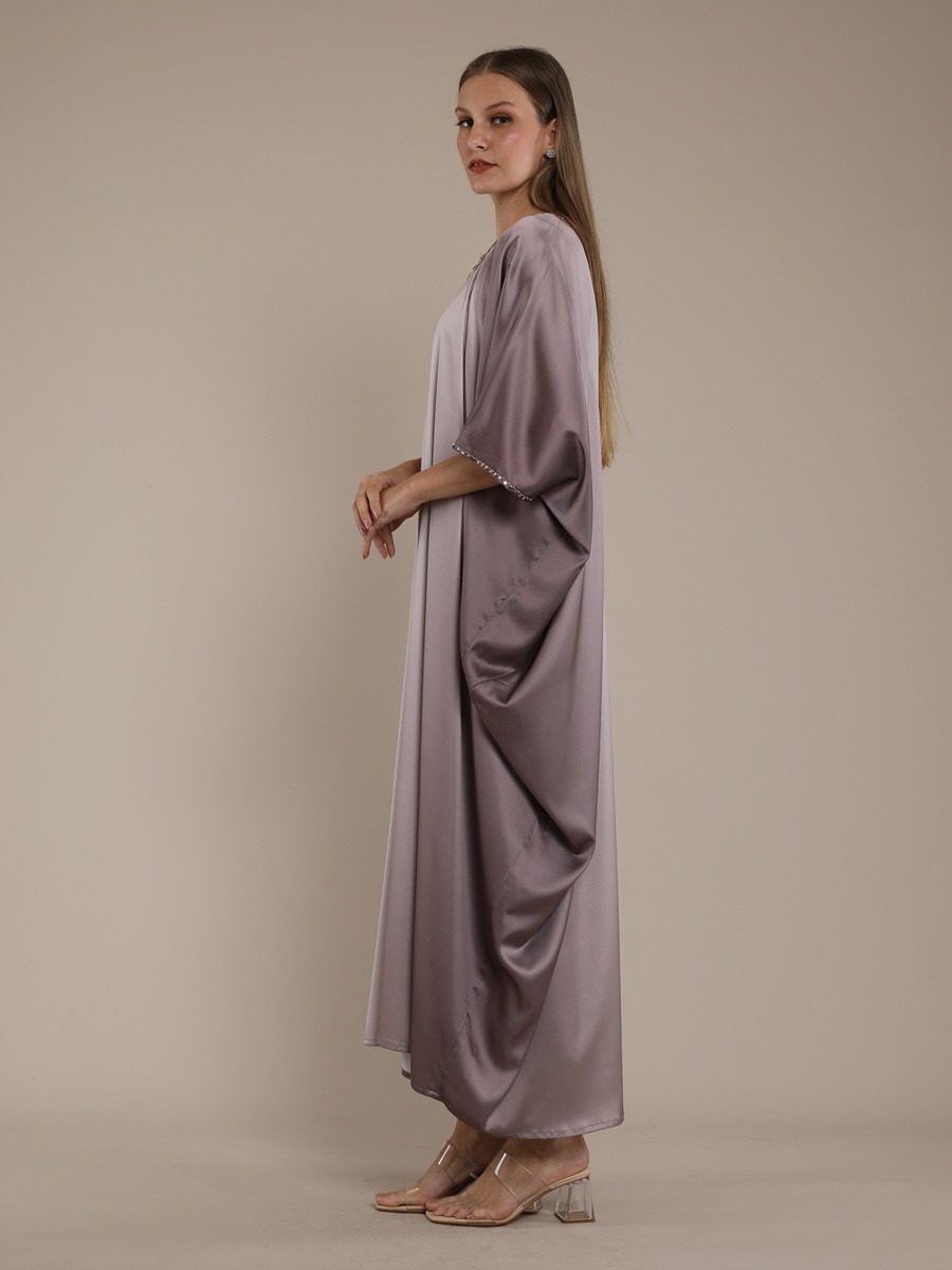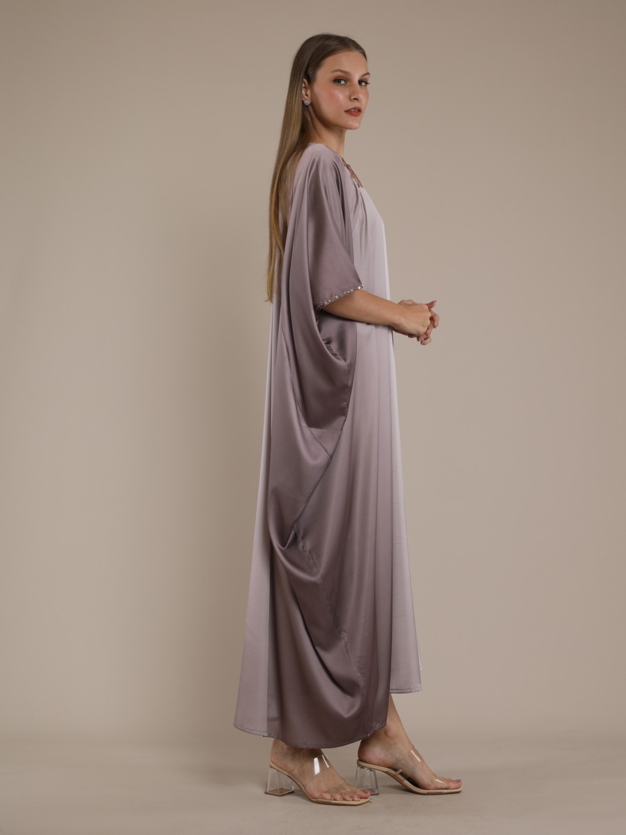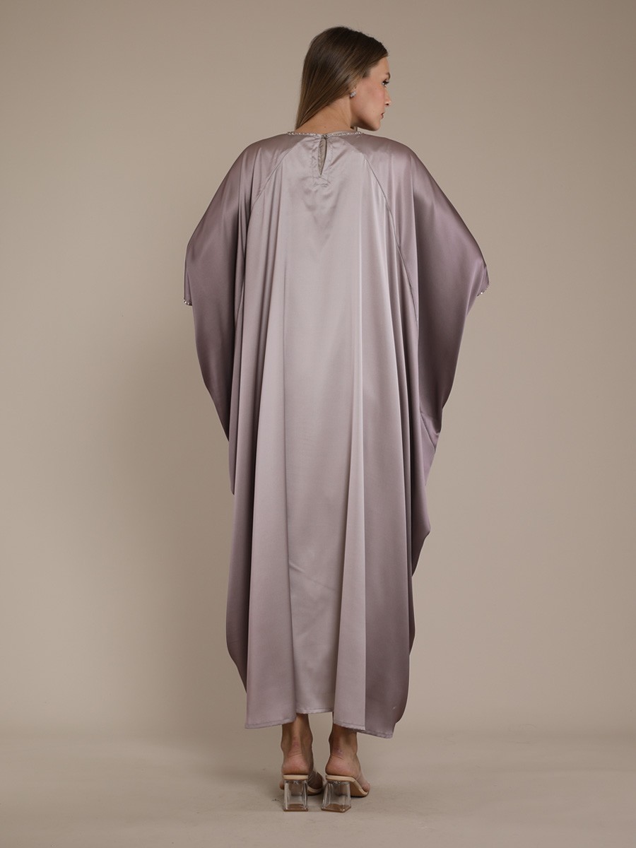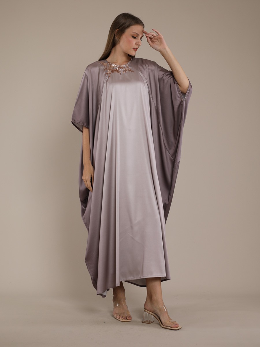 This is an elegant,floor-length kaftan-style dress featuring a fluid,oversized silhouette and a sophisticated Ombre Mocca color palette.It blends traditional modesty with contemporary evening wear aesthetics.A rounded neckline decorated with intricate floral silver embroidery and sequins,adding a focal point of texture and sparkle.