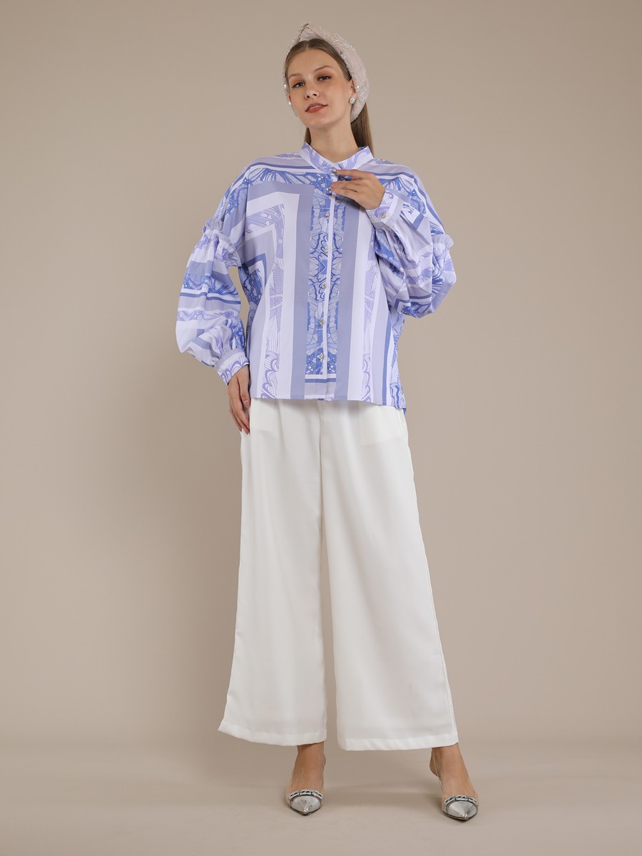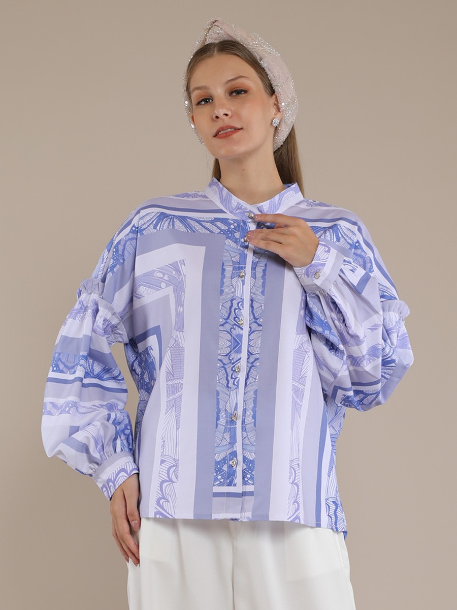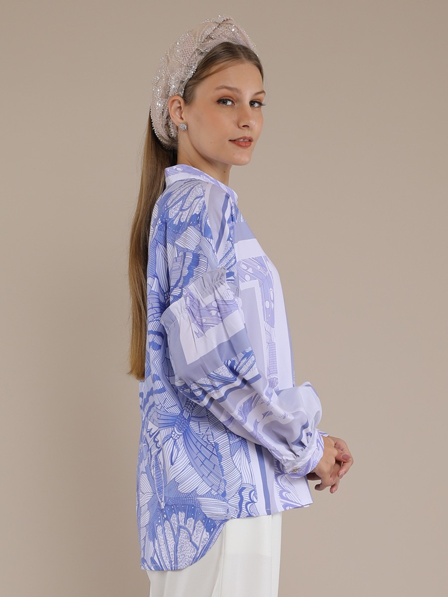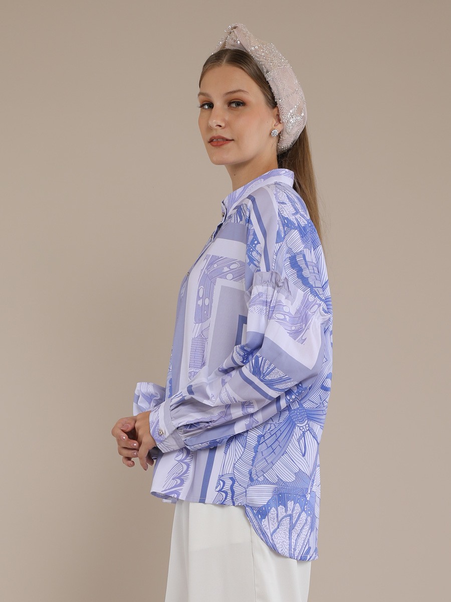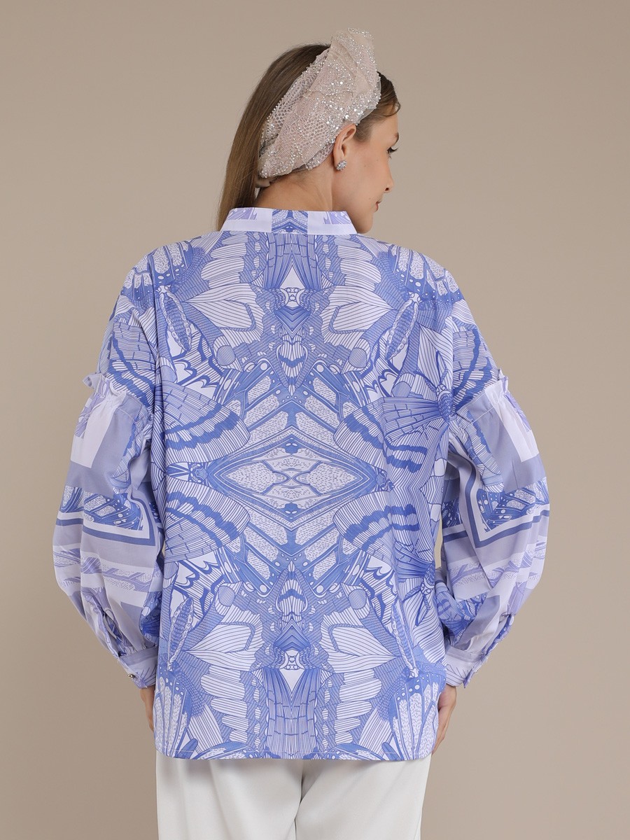 This blouse BLUE BUTTERFLY BOHO SHIRT BLOUSE is a contemporary,relaxed-fit button-down that balances bold graphic elements with delicate tailoring.It features a periwinkie and white color palette with a complex,symmetrical tile-style print reminiscent of architectural.