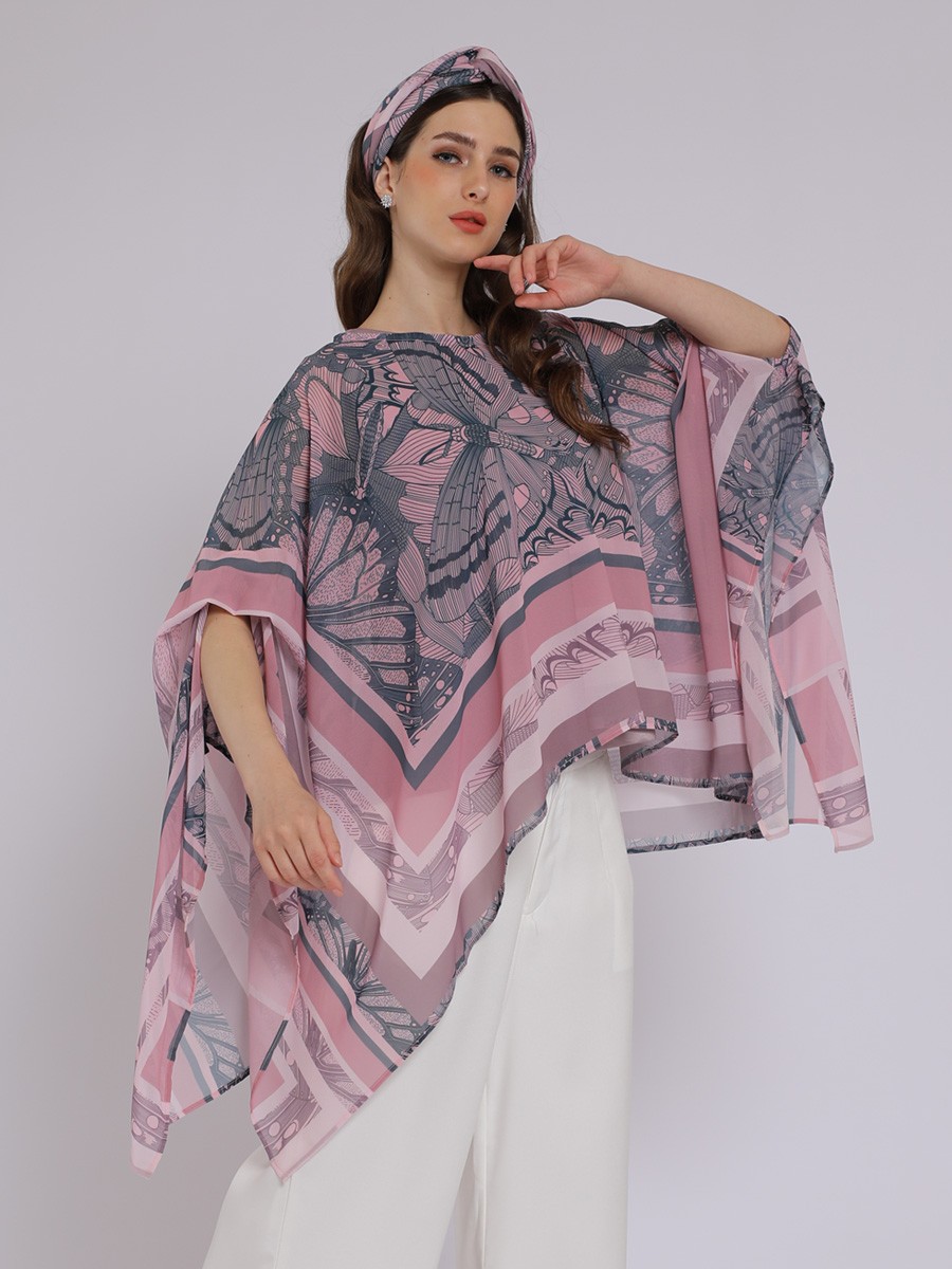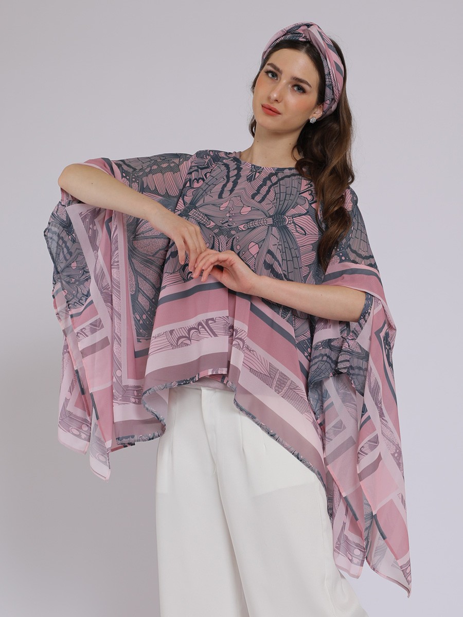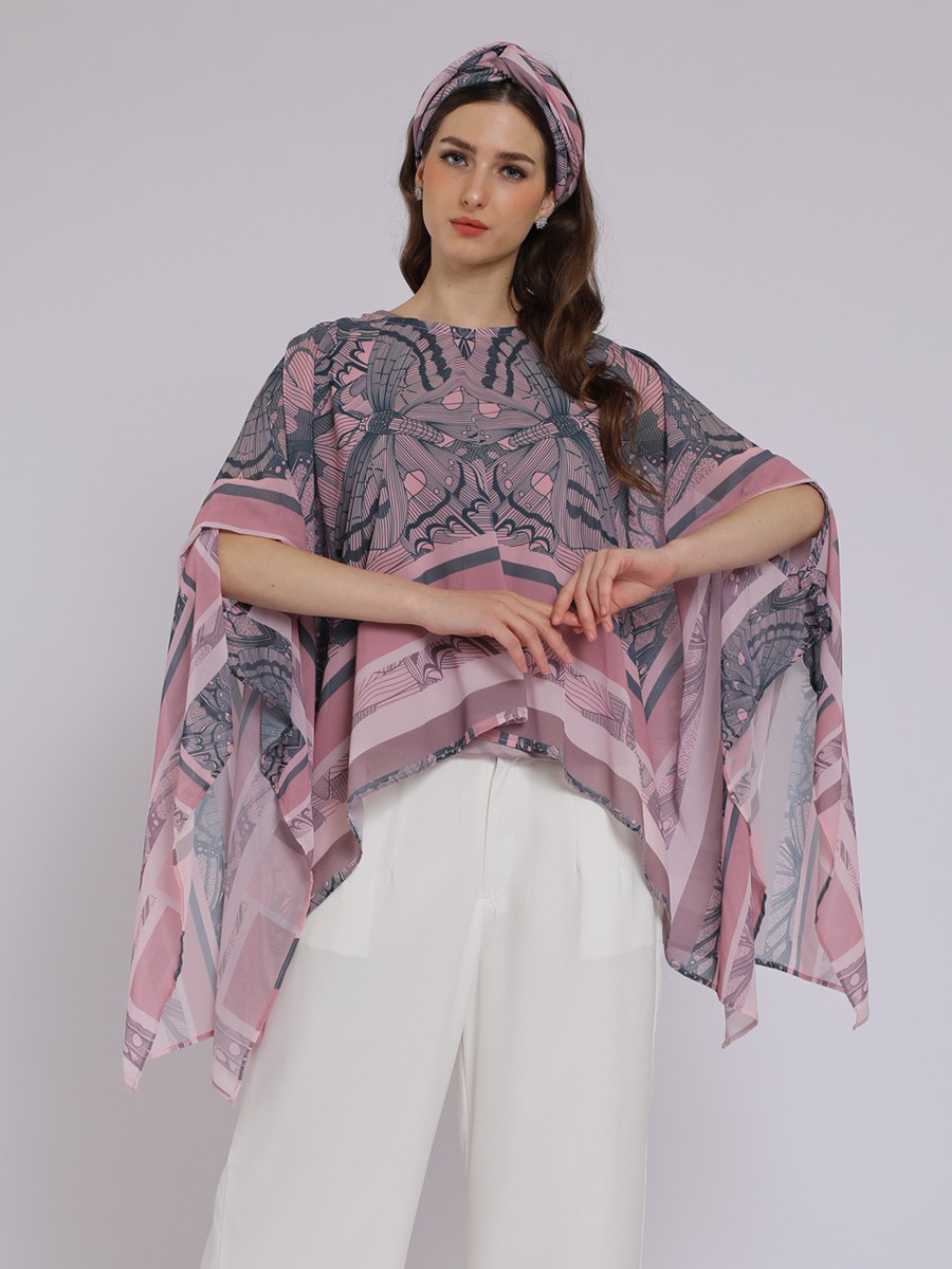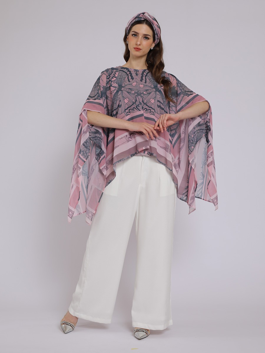 This PINK BUTTERFLY DRAPERY KAFTAN blouse is a contemporary,batwing-style kaftan top that emphasizes fluid movement and a soft,feminine aesthetic.It features an oversized,asymmetric"butterfly" drape with wide,open sleeves that create a cape-like effect.The hemline is shorterin the front and longer aat the sides,providing a dynamic,airy silhouette.