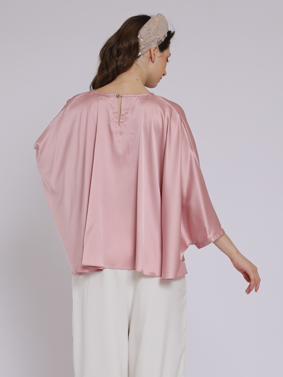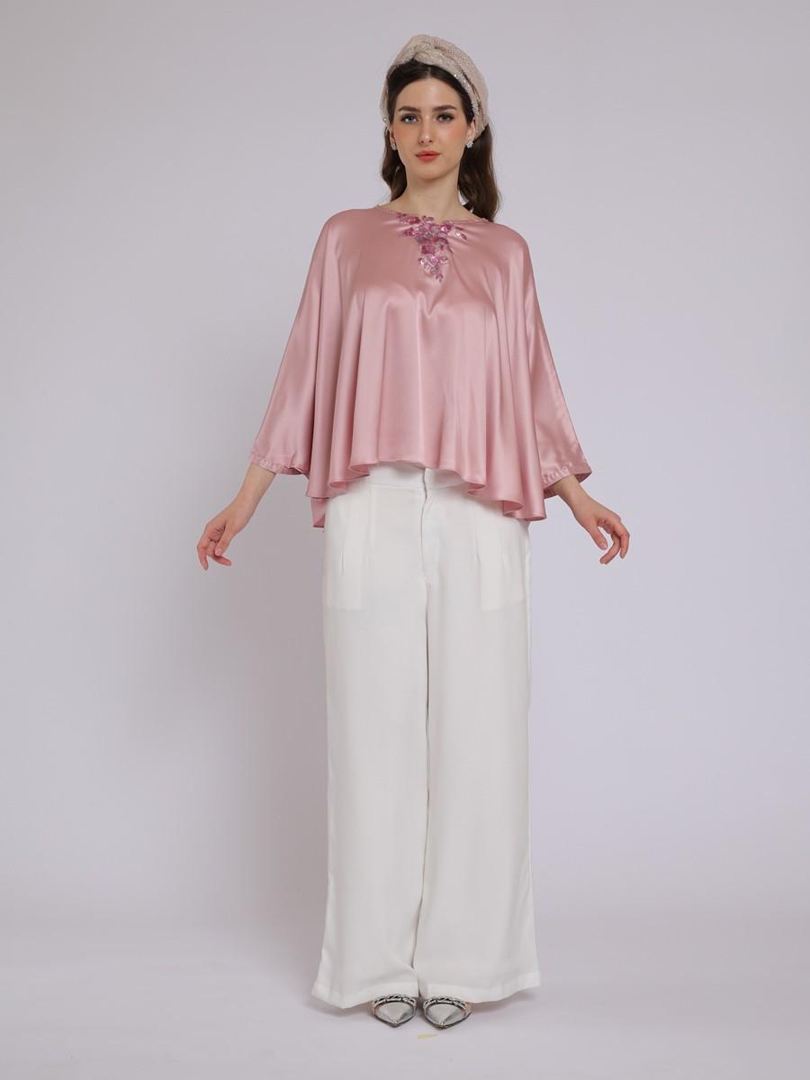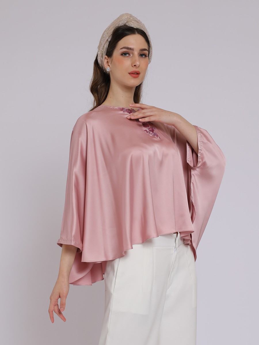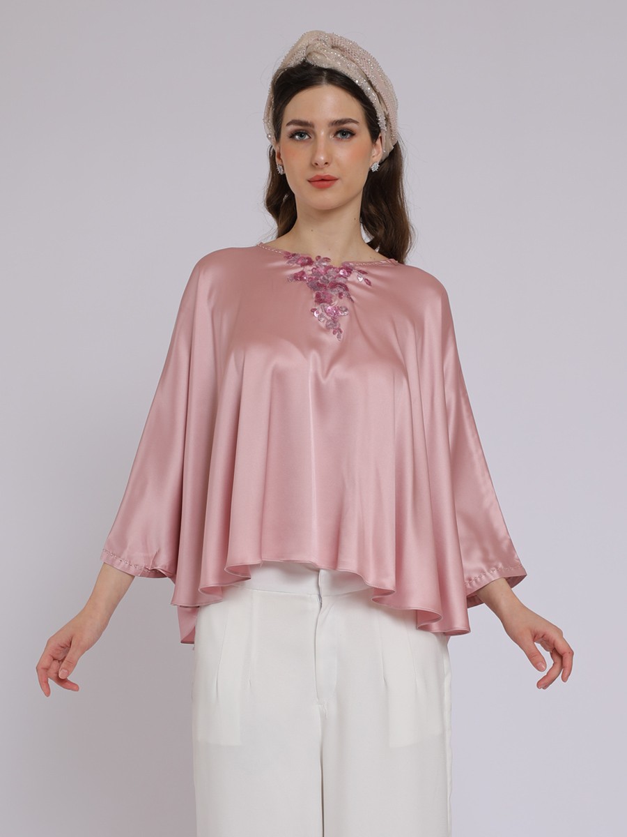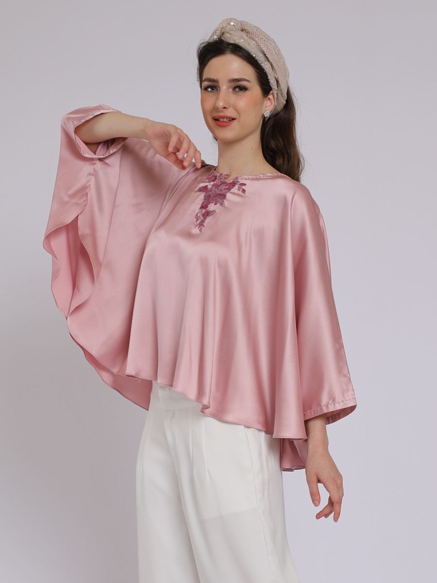 A wide,oversized poncho or kaftan-style cut that creates dramatic,flowing"butterfly" sleeves.The most striking feature is a vibrant pink floral embellishment cascading down from the neckline.