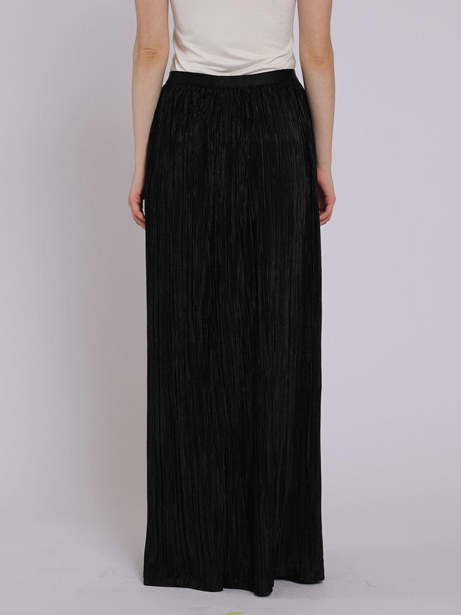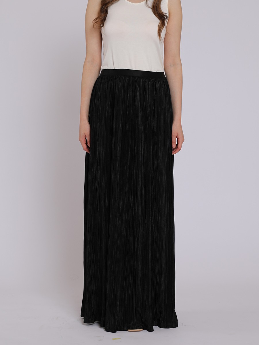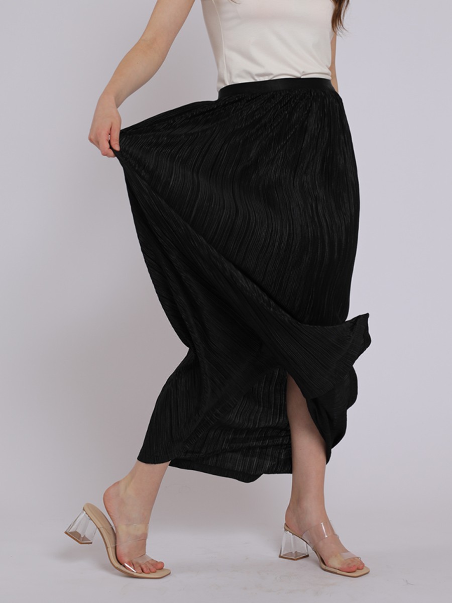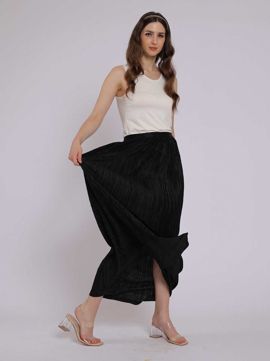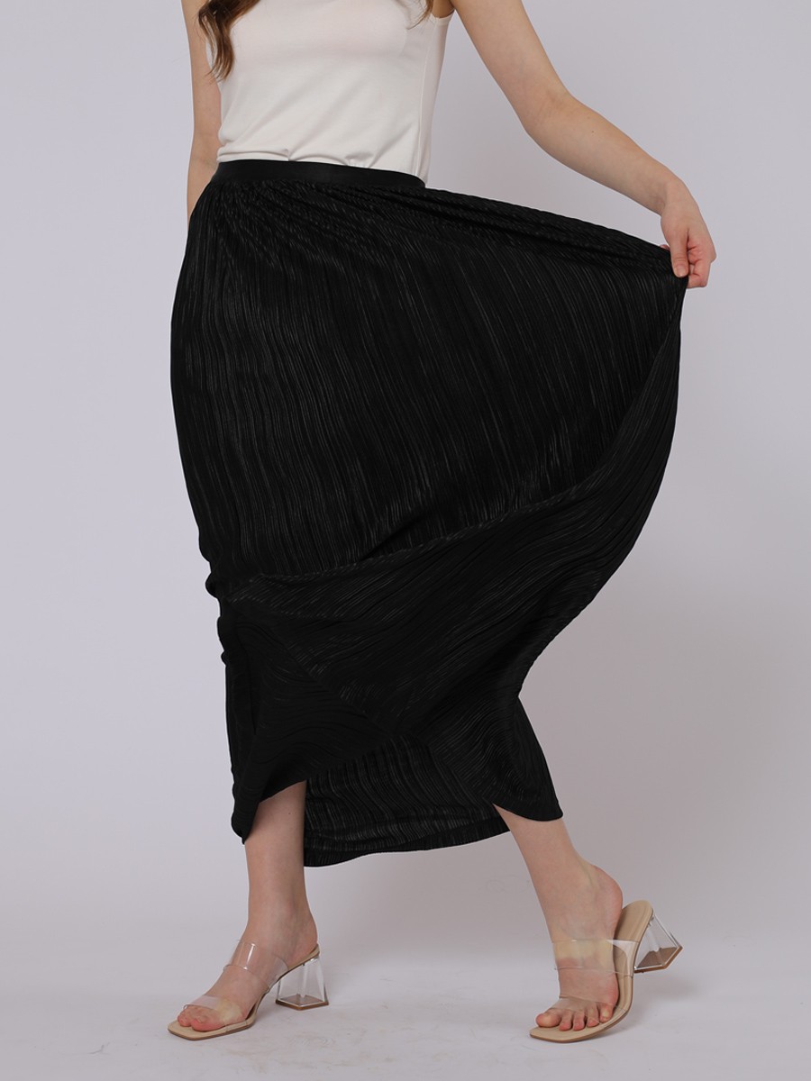 This is sophisticated maxi-length pleated skirt that strikes a perfect balance between evening elegance and modern minimalism.A shimmering black with a subtle metallic sheen,giving it a festive,high-end feel.