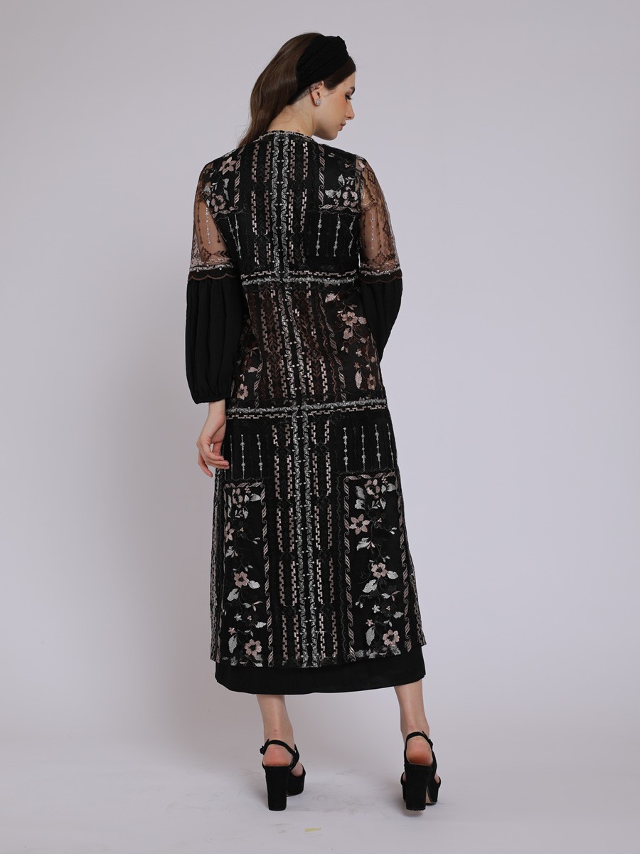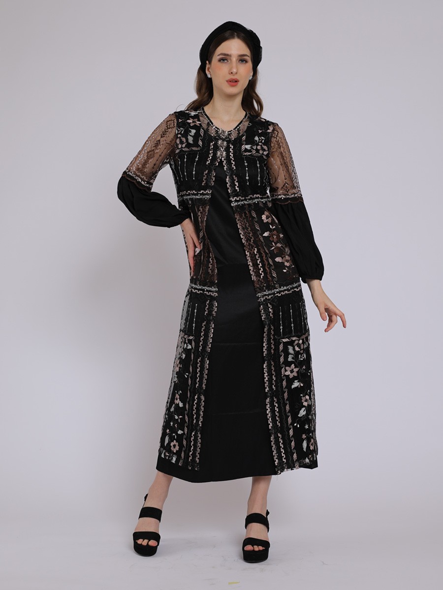 This elegant ensemble is a sophisticated take on modern modest wear,featuring a multi-layered silhouette in a timeless black and metallic palette.A unique hybird design featuring sheer embroidered upper arms that transition into dramatic black balloon sleeves with elasticized cuffs.