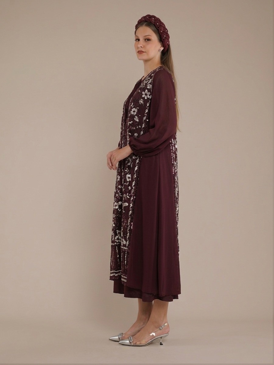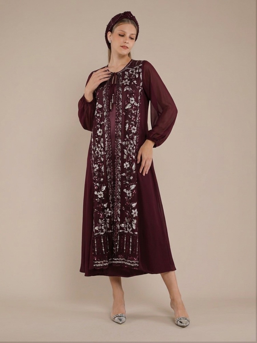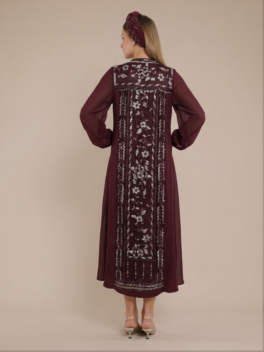 This Maroon Iris Abaya two-piece maxi dress features a sheer maroon chiffon and tule overlay with vertical floral embroidery.It wears beautifully over a simple silky slip an ties at the neck with beaded fringe accents.A unique embroidered panel on the back adds a structured,stylish touch to the flowing fabric.