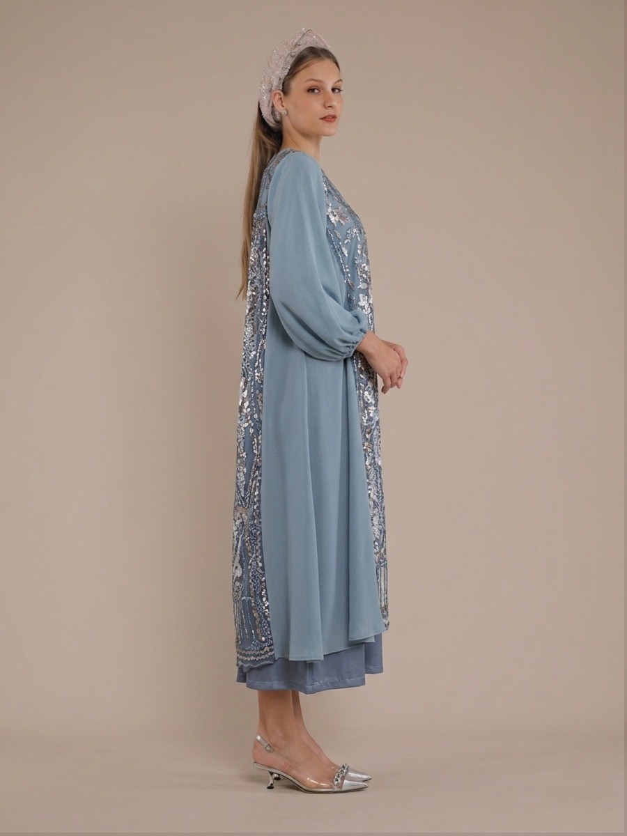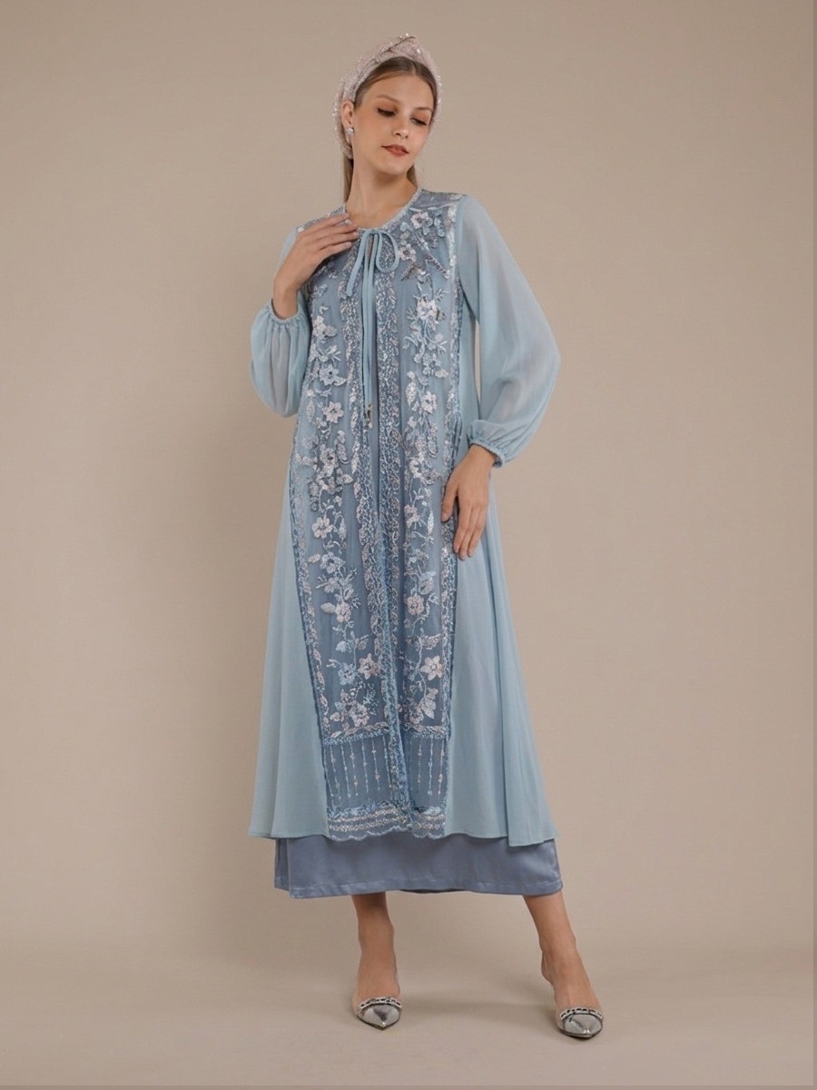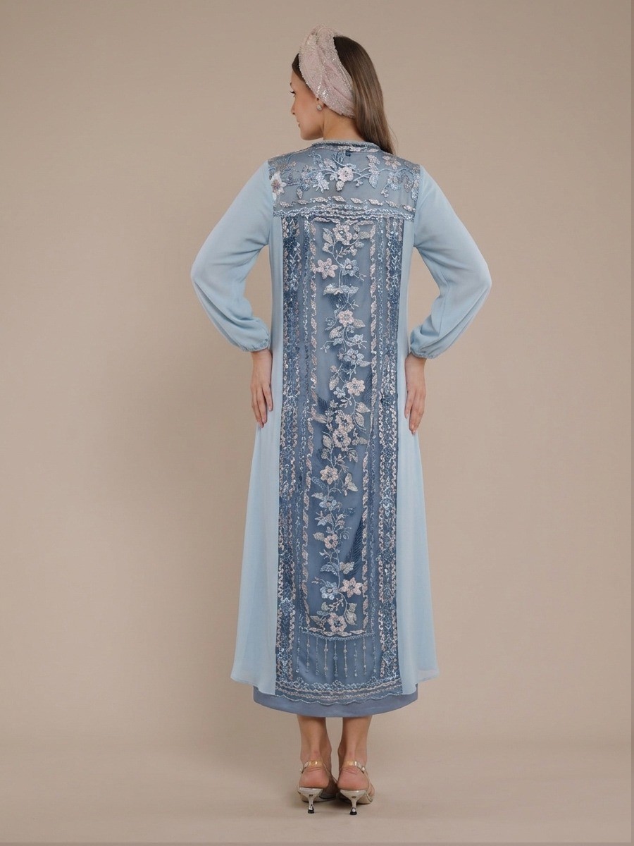 This Blue Iris Abaya two-piece maxi dress features a sheer blue chiffon and tule overlay with vertical floral embroidery.It wears beautifully over a simple silky slip an ties at the neck with beaded fringe accents.A unique embroidered panel on the back adds a structured,stylish touch to the flowing fabric.