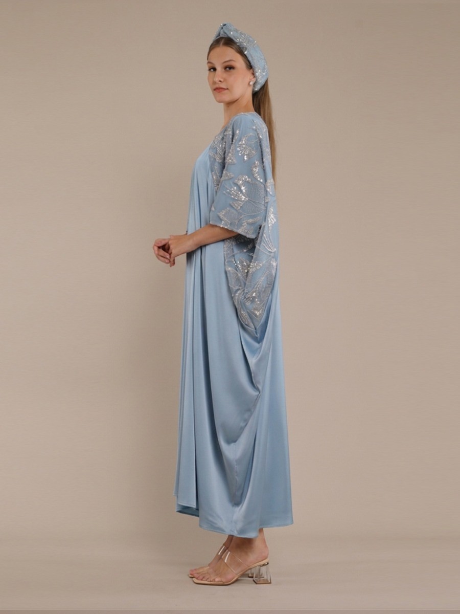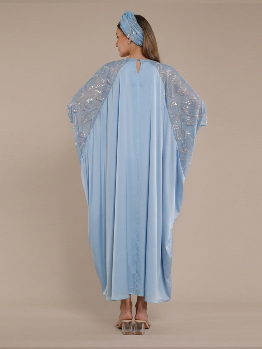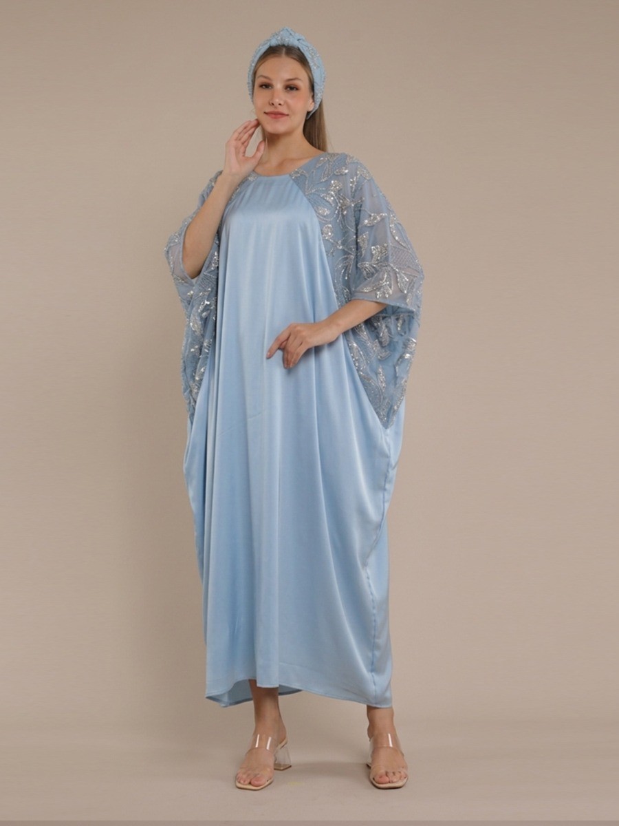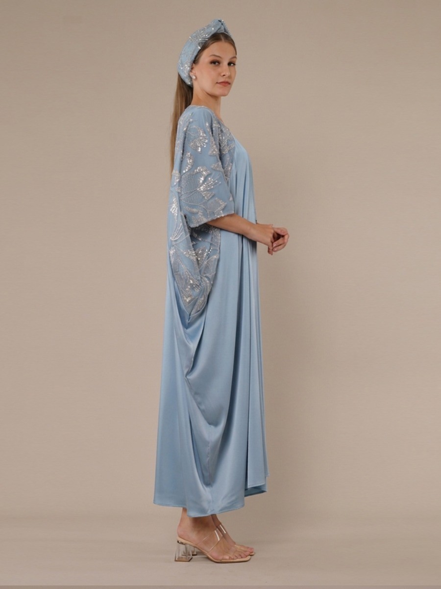 This is a floor-length,elegant kaftan-style gown in a soft blue satin,it's a sophisticated piece that blends traditional modest silhouettes with contemporary evening wear deatils.The shoulders and sleeves are heavily adorned with silver beadwork and sequins in a swirling feather-like patter.This adds texture and a reflective "festive"quality to garment.