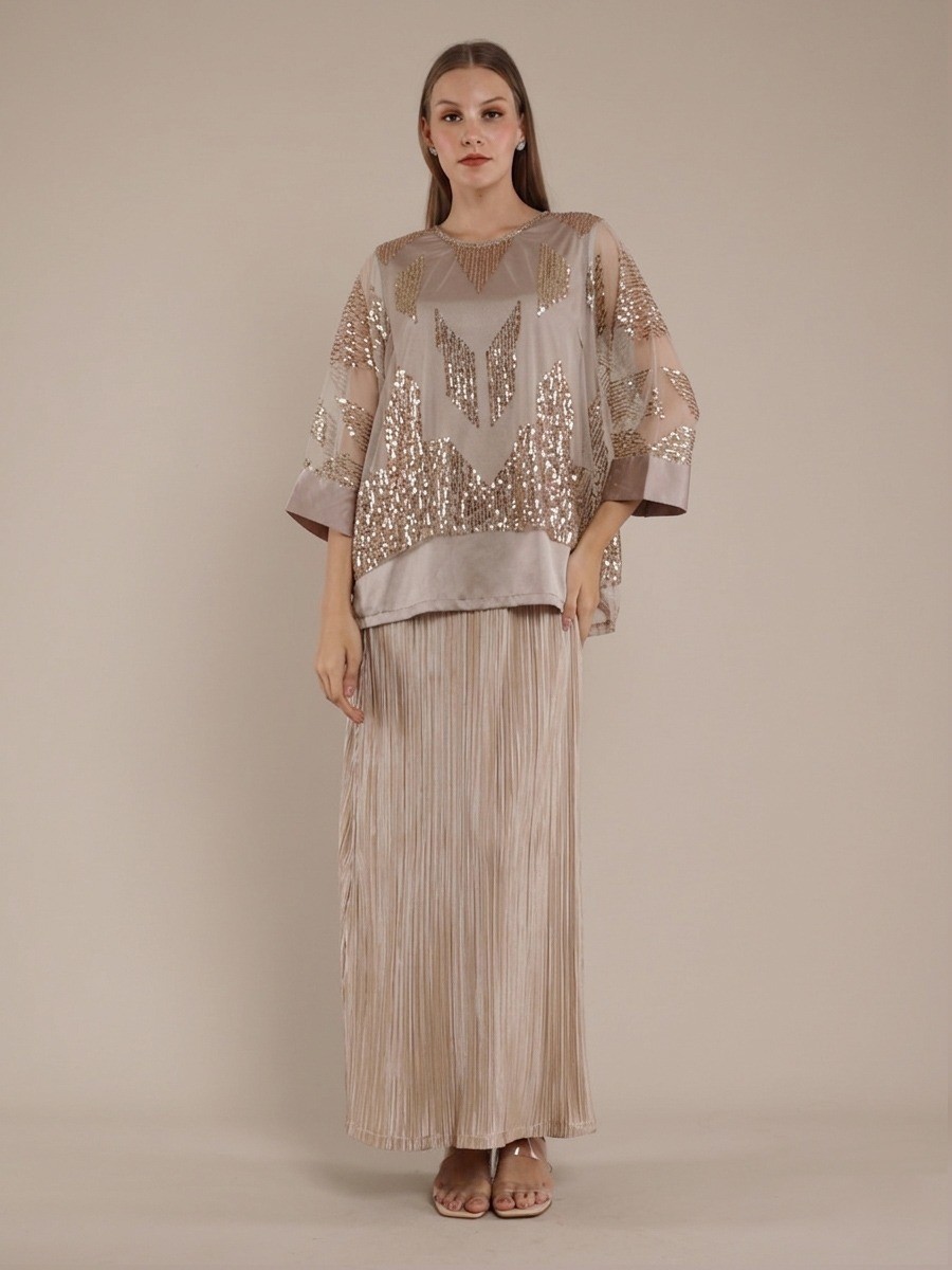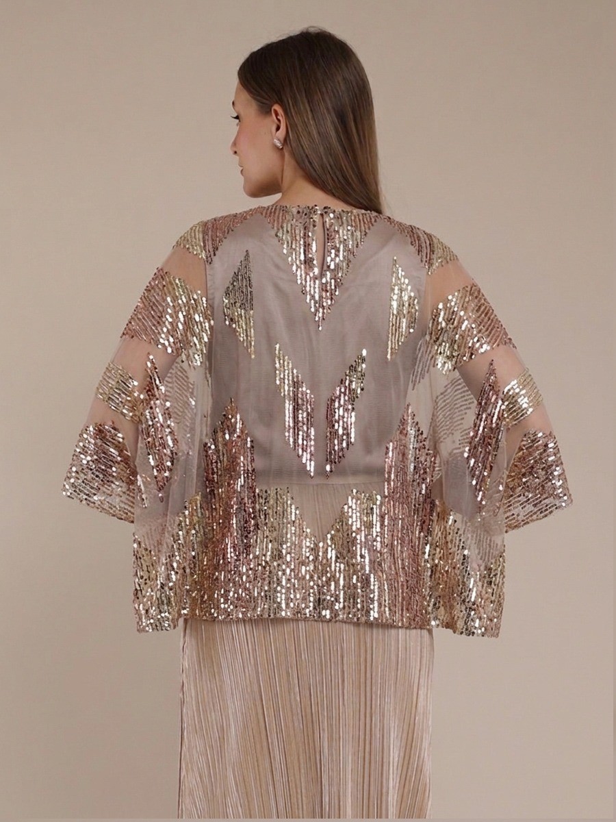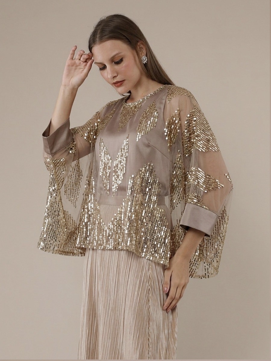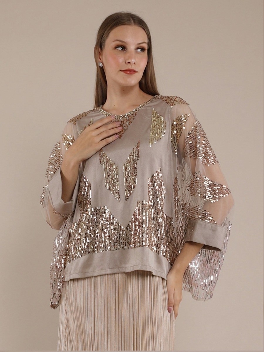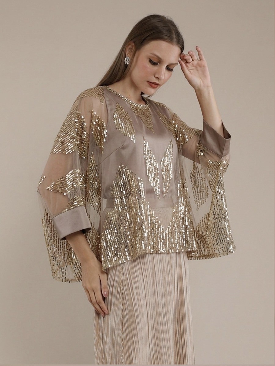 A Sophisticated blend of sequined tulle and geometric artistry.This gold kaftan blouse features hand-applied beads at the neckline and a transparant silhouette,perfectly layered over a matching sleeveless satin top.