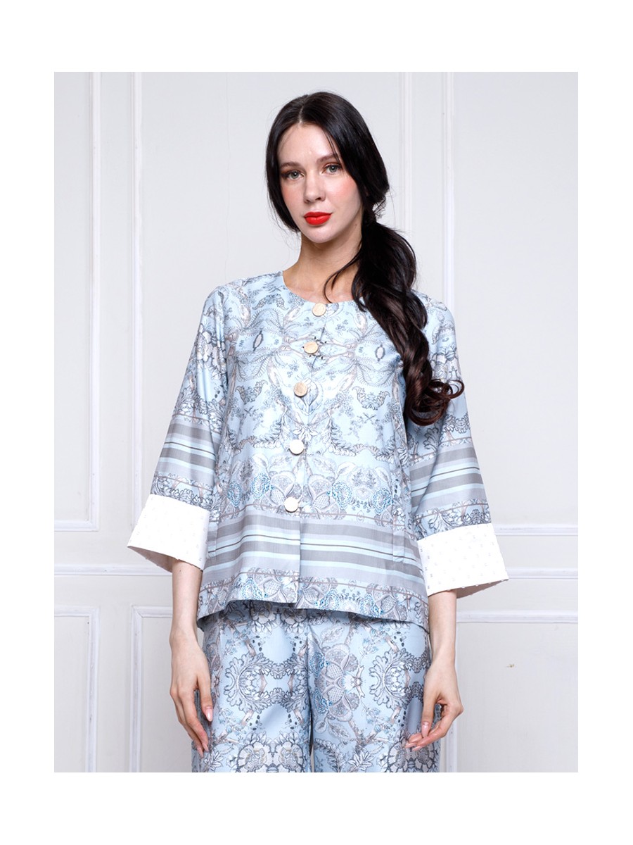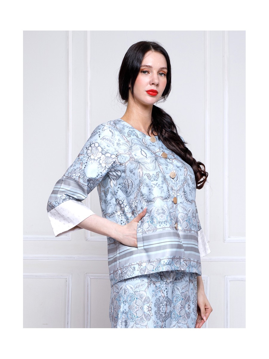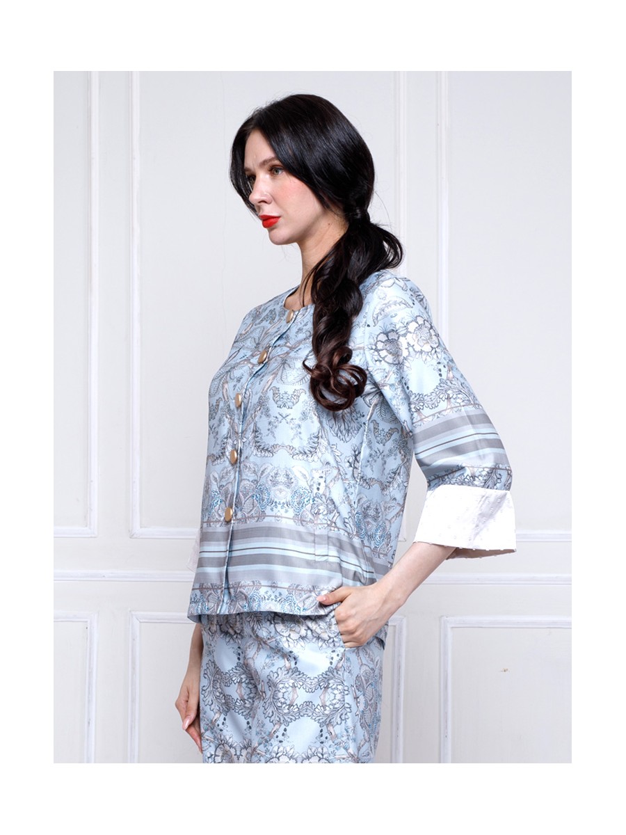 Designed for refined elegance and exceptional comfort,this garment is made from a luxurious blend of soft and rubia satin.Its striking appeal comes from an elegant Winter Flower pattern,a statement large gold button closure,and a fashionable wide sleeve opening.