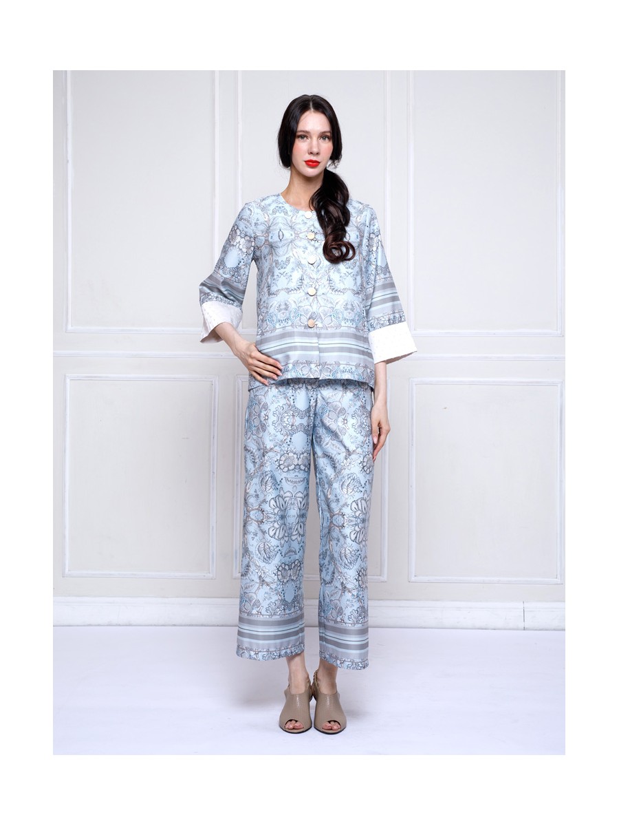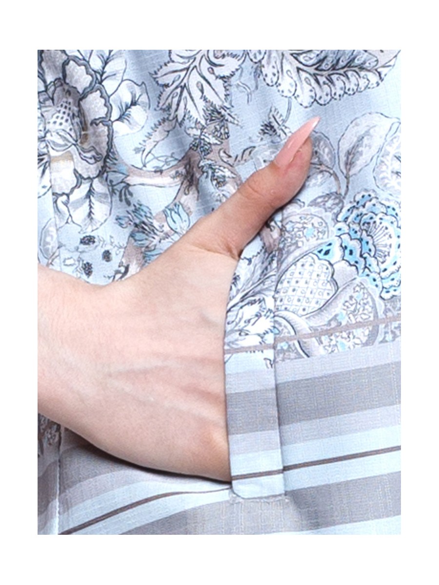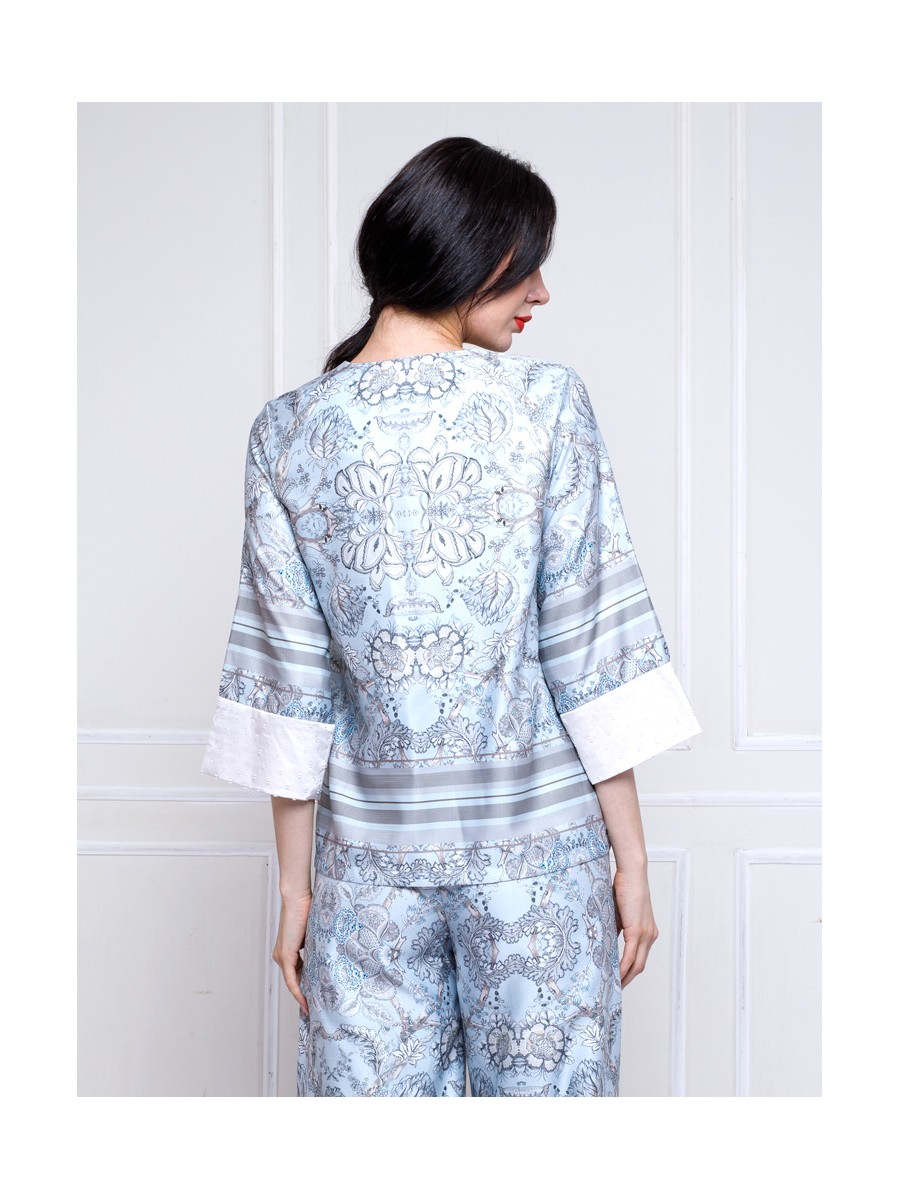 Designed for refined elegance and exceptional comfort,this garment is made from a luxurious blend of soft and rubia satin.Its striking appeal comes from an elegant Winter Flower pattern,a statement large gold button closure,and a fashionable wide sleeve opening.